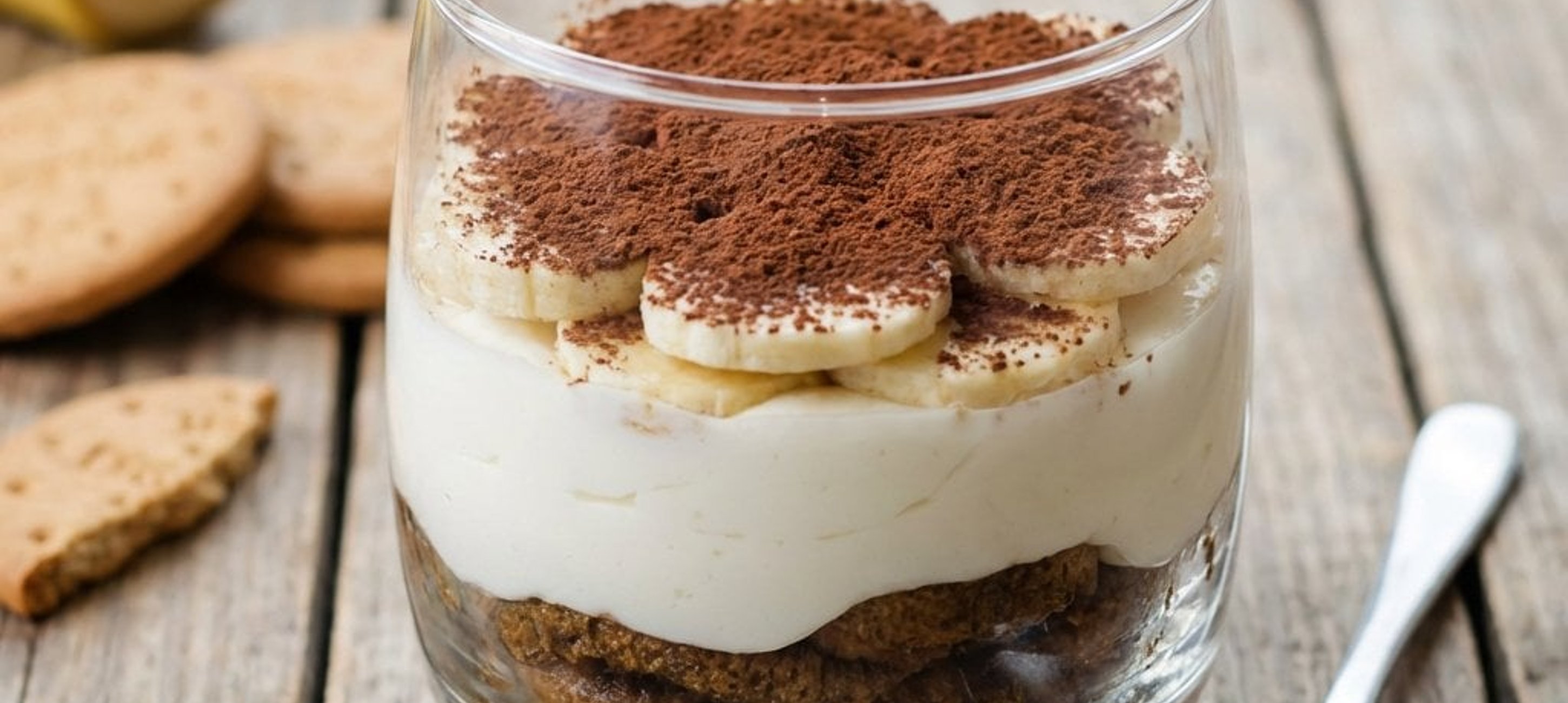 - 4Repetați procesul cu restul de biscuiți, felii de banană și brânză de vaci, creând straturi succesive până la epuizarea ingredientelor.