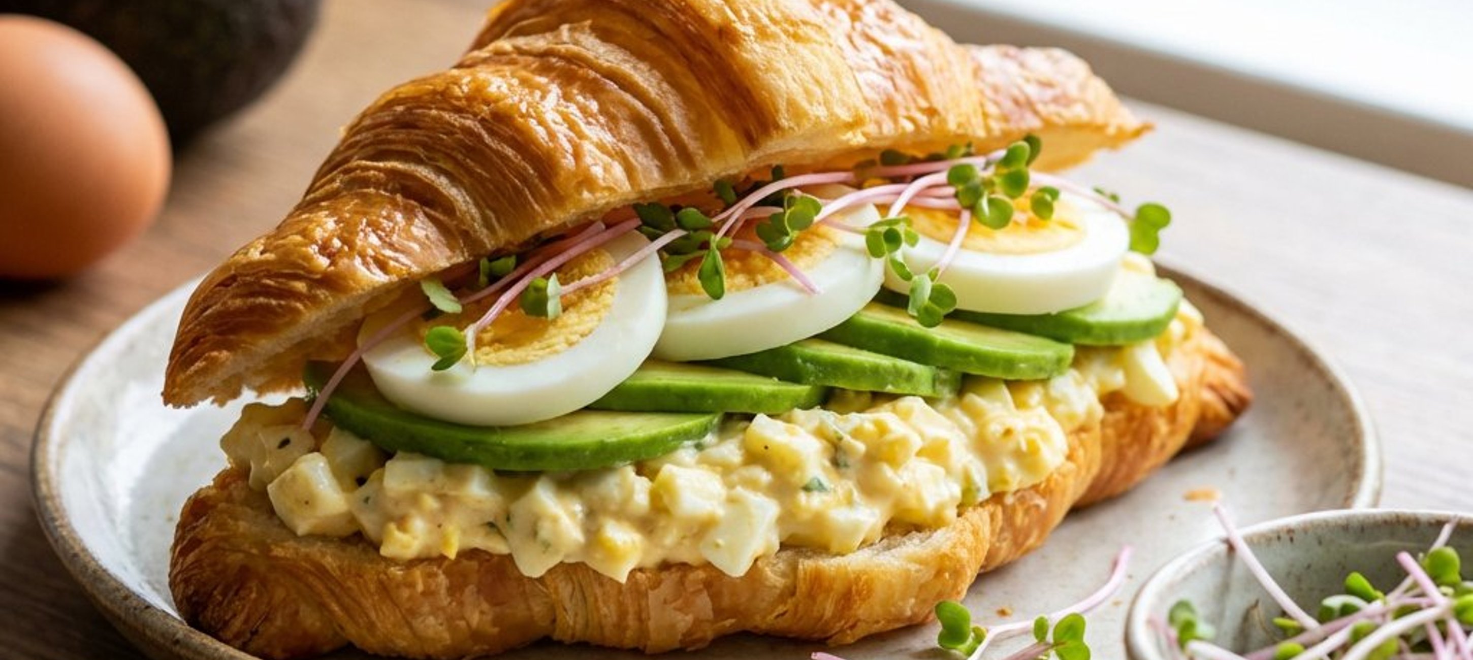- 3Adăugați felii de avocado proaspăt, oul fiert tare tăiat rondele și germenii de ridiche după gust. Serviți imediat pentru a vă bucura de textura crocantă a croissantului.