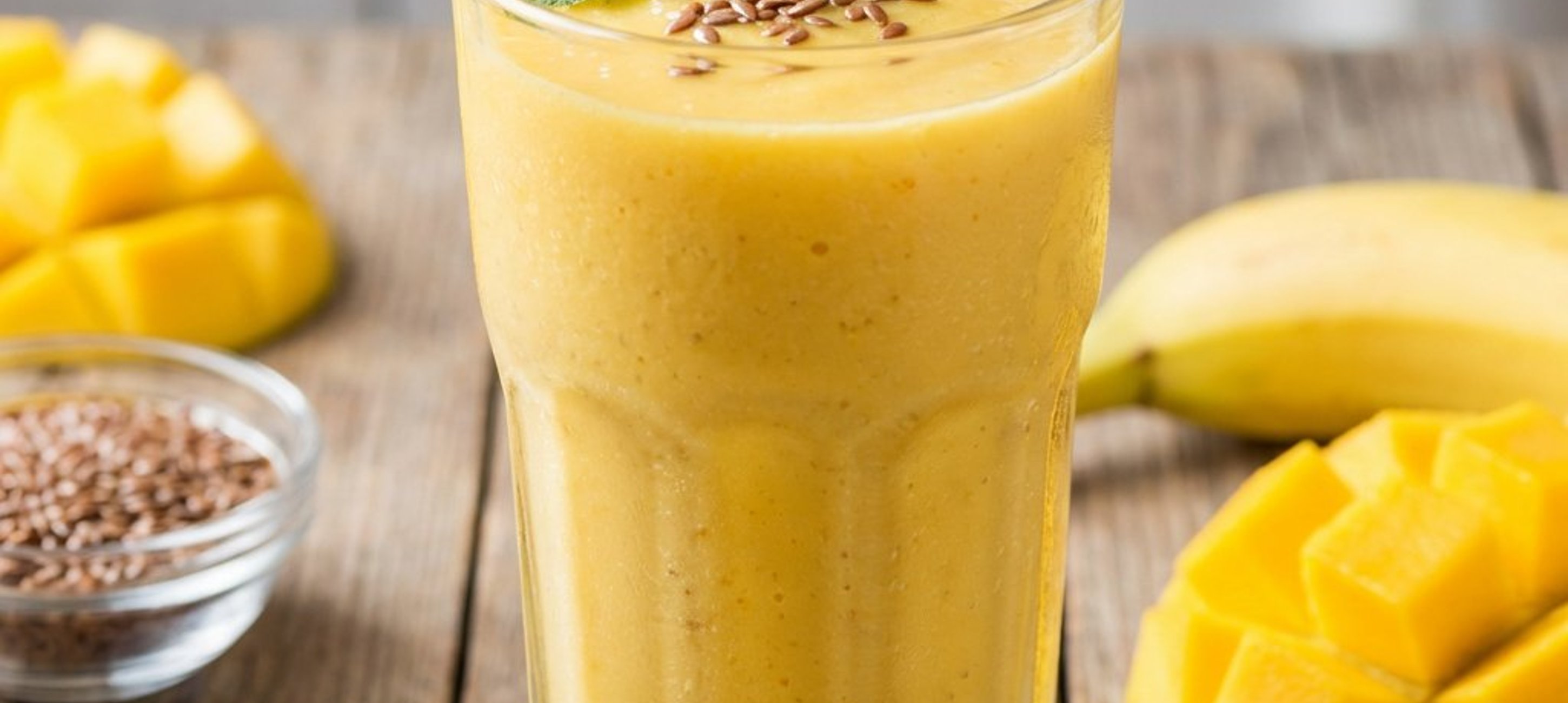 - 4Turnați smoothie-ul într-un pahar înalt și decorați cu semințe de in și frunze proaspete de mentă.