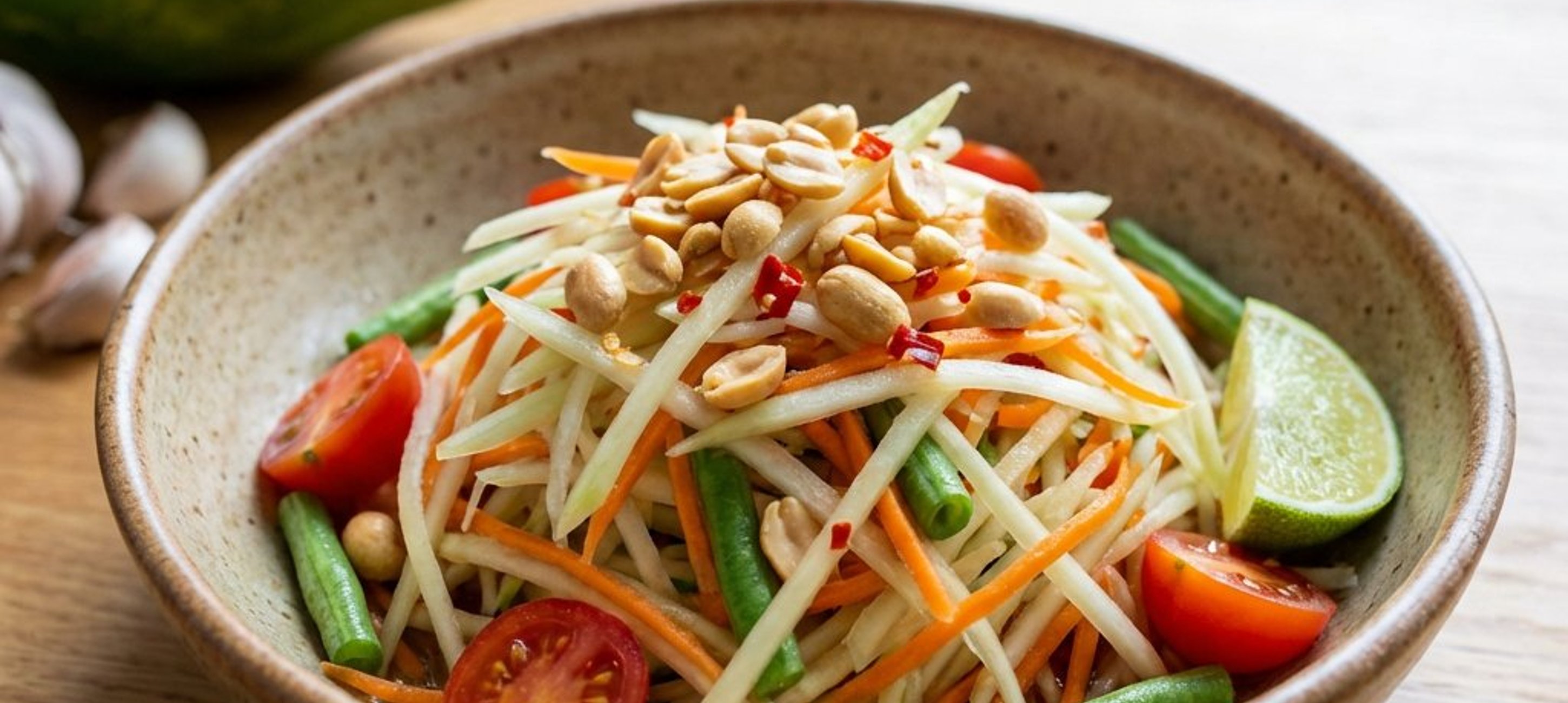 - 3Turnați amestecul din mojar peste fâșiile de papaya și morcov. Adăugați restul de suc de lime (50g) și fasolea verde. Amestecați energic folosind o lingură și pistilul mojarului, presând ușor ingredientele pentru a absorbi aromele. Lăsați salata să se odihnească 5 minute. Presărați arahidele prăjite deasupra înainte de servire.