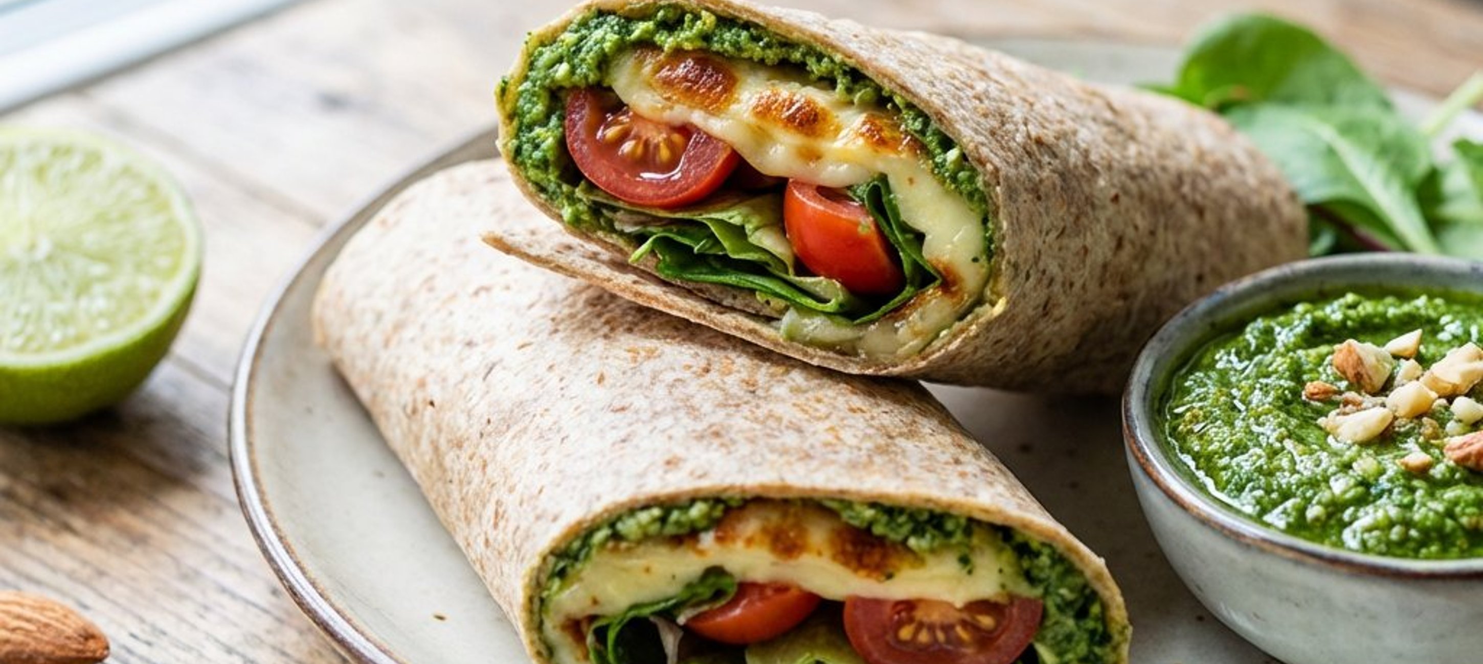 - 4Încălziți ușor tortillele într-o tigaie uscată. Ungeți fiecare tortilla cu un strat generos de pesto de spanac, adăugați un amestec de salată verde, roșiile cherry și, la final, feliile de brânză la grătar.