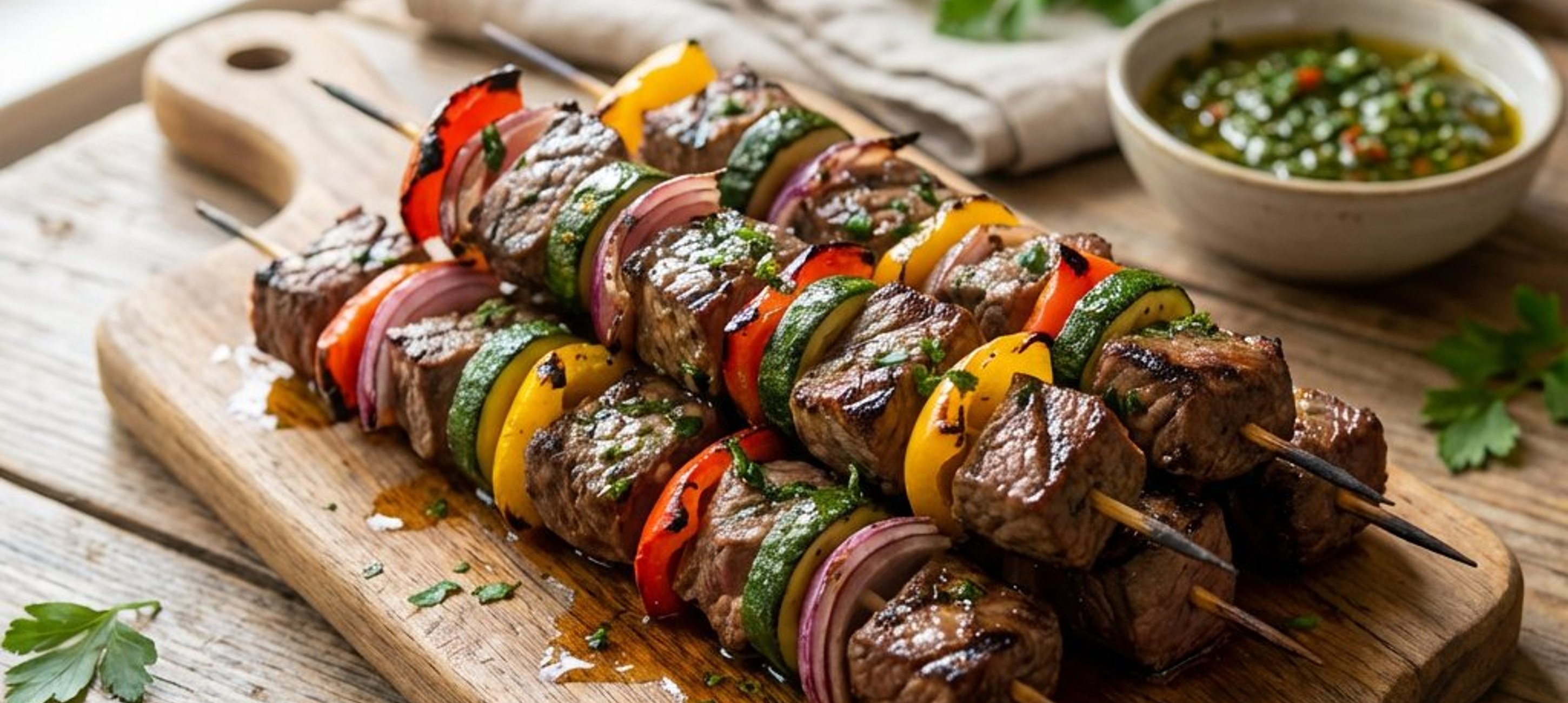 Poți adăuga și ceapă roșie sau roșii cherry între bucățile de carne pentru un plus de culoare și savoare.