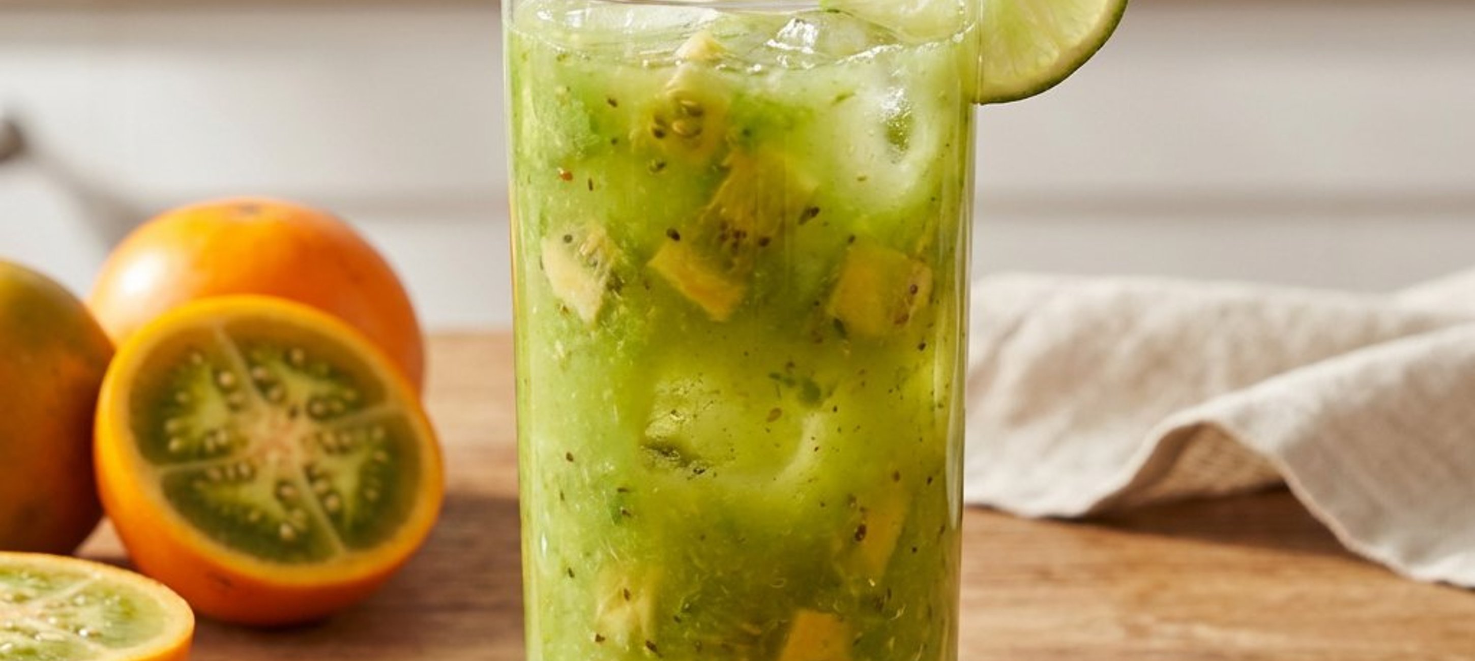 - 3Toarnă amestecul într-un pahar plin cu gheață, adaugă cubulețele de lulo rămase și amestecă ușor. Servește imediat pentru o prospețime maximă.