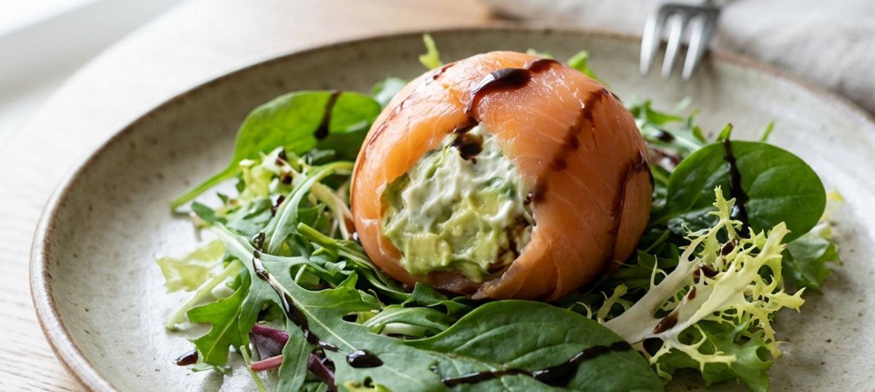 - 2Așezați mixul de salată verde pe o farfurie. Desfaceți cu grijă bila de somon din folie și puneți-o în centrul salatei. Stropiți totul cu dressingul pregătit și serviți imediat.