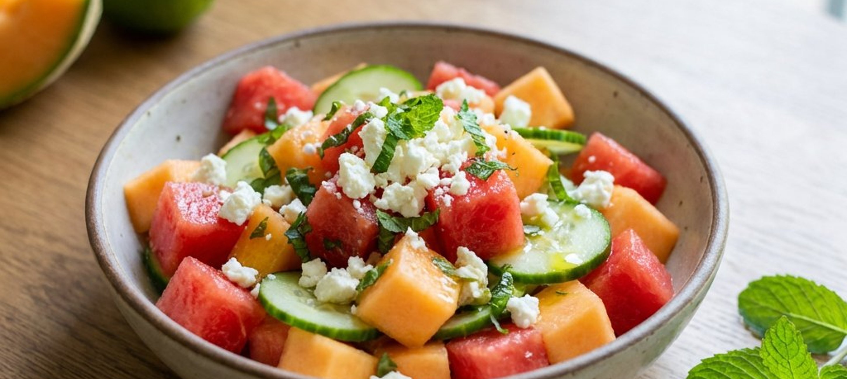 - 2Tăiați brânza feta în cubulețe mici și adăugați-o peste amestecul de pepene și castravete.
