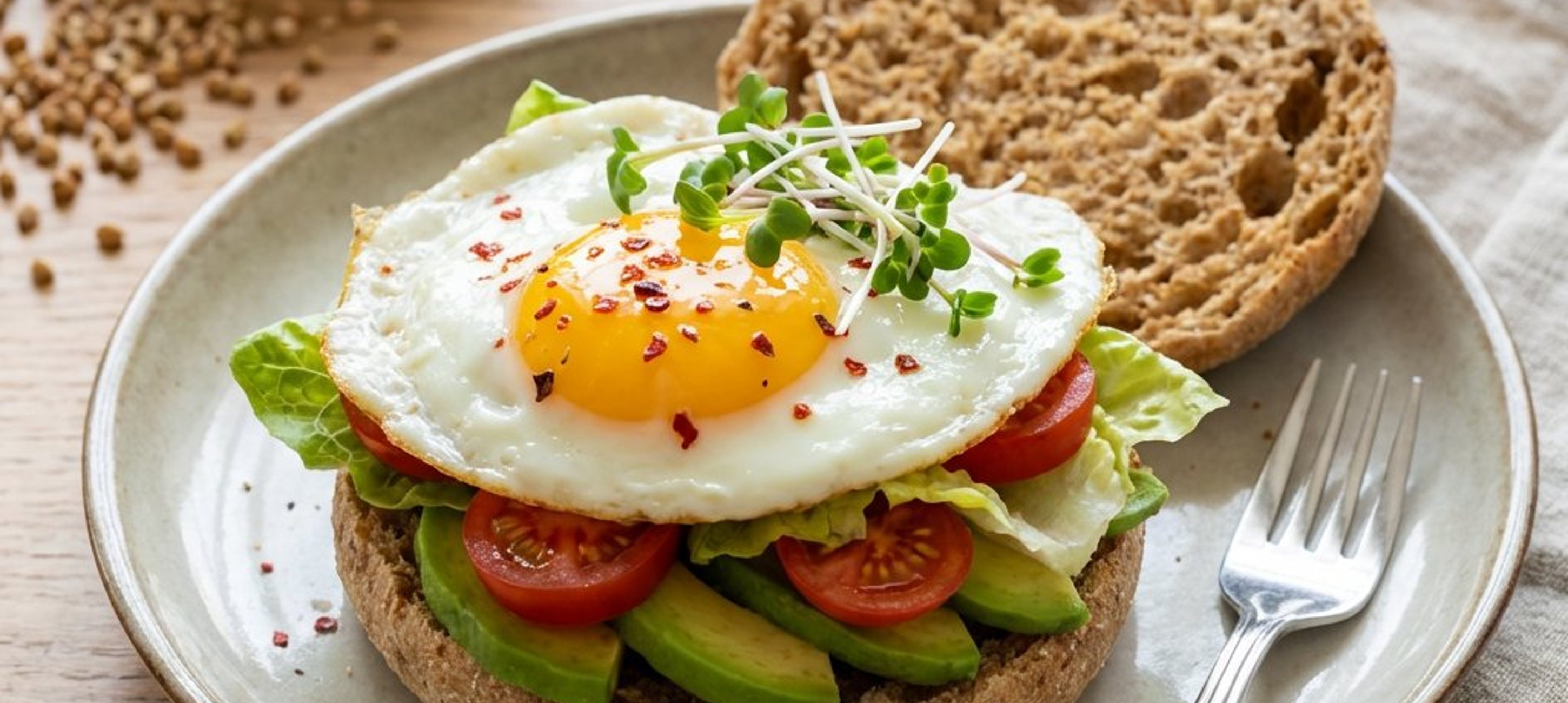 - 2Tăiați brioșa în jumătate și prăjiți-o ușor pe ambele părți întro tigaie uscată sau cu puțin unt. Așezați în interiorul brioșei salata, roșiile, feliile de avocado (condimentate cu sare, piper și stropite cu suc de lime), oul ochi deasupra și câțiva lăstari de ridiche. Savurați un mic dejun delicios!