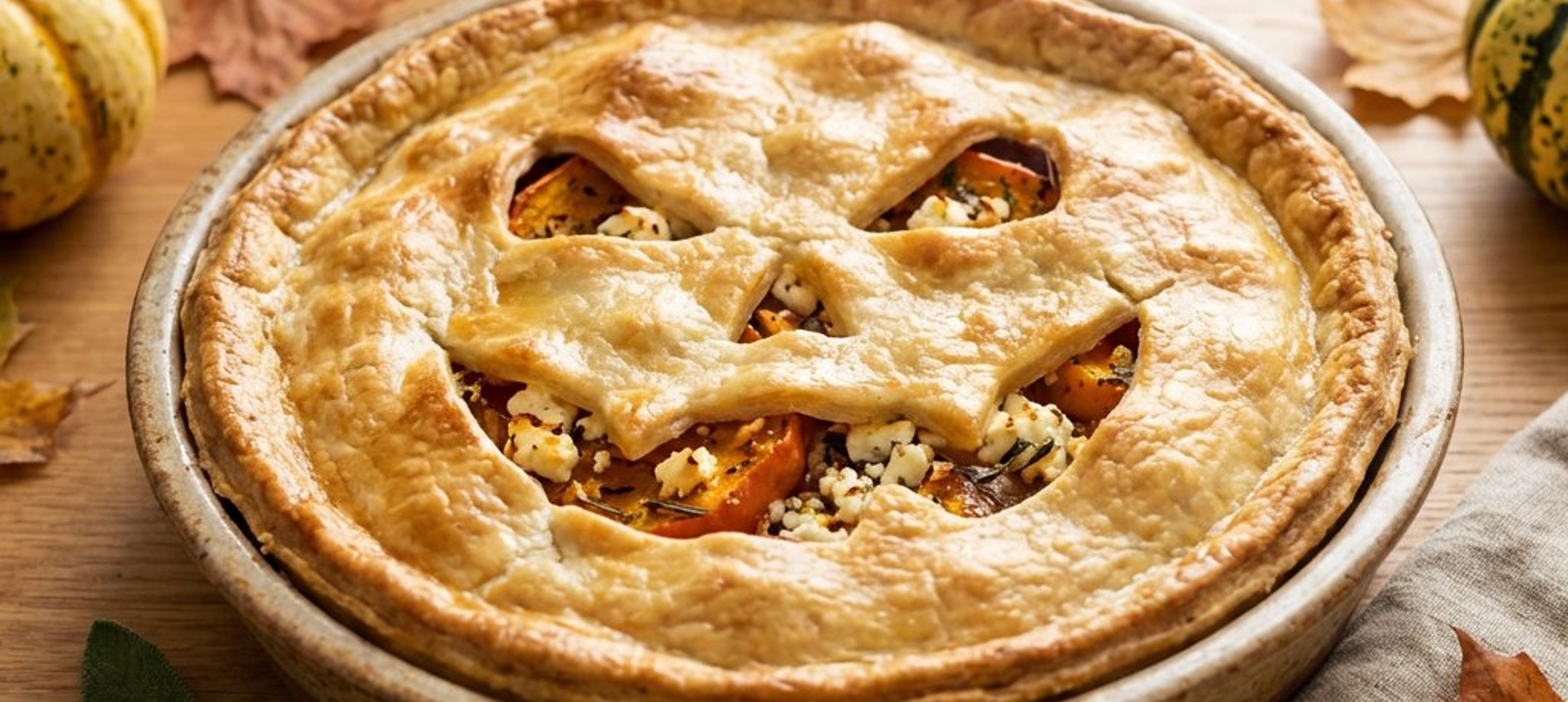 - 3Tăiați ceapa roșie în semilune și căliți-o în restul de ulei până devine aurie. Lăsați-o să se răcească, apoi încorporați ouăle bătute și brânza feta sfărâmată. Adăugați rozmarinul și dovleacul copt, transformat în prealabil întrun piure fin cu ajutorul unui blender. Turnați amestecul de dovleac în formă. Din a doua parte de aluat, decupați ochii, nasul și gura (ca la un dovleac de Halloween). Așezați aluatul decupat deasupra umpluturii și sigilați marginile apăsând cu o furculiță.