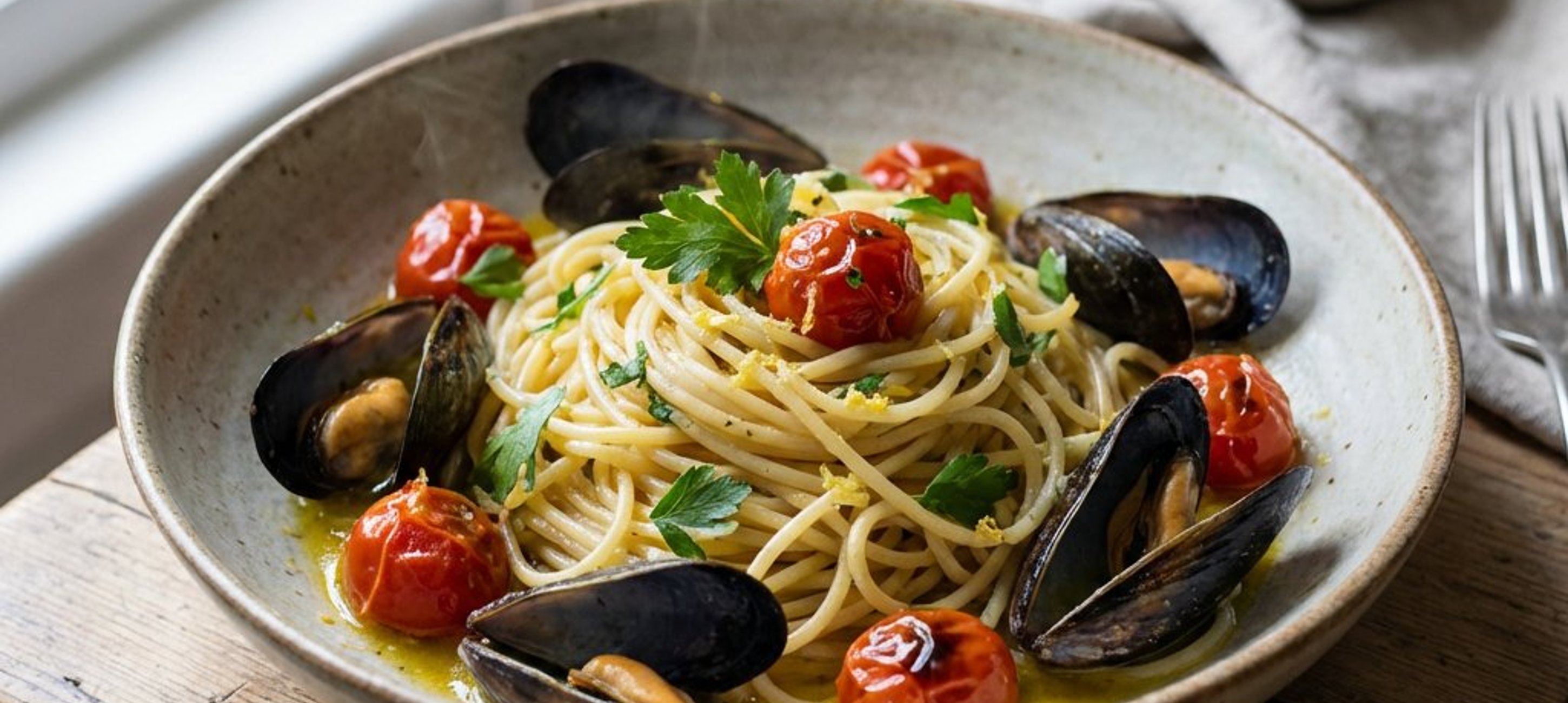 - 2Adăugați roșiile cherry tăiate în sferturi. Între timp, fierbeți spaghetele în apă cu sare până devin al dente. Cu aproximativ un minut înainte de a fi gata, transferați spaghetele direct în tigaia cu midii.