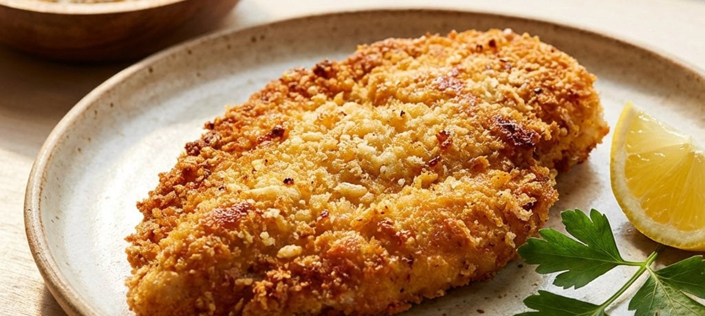 - 2Într-o tigaie adâncă, turnați uleiul (aproximativ 0,5 cm) și încingeți-l bine. Treceți fiecare bucată de pui mai întâi prin făină, apoi prin amestecul de ou și, la final, prin pesmetul cu parmezan, presând ușor pentru a adera bine. Prăjiți șnițelele la foc mediu timp de 2-4 minute pe fiecare parte, până devin aurii și crocante.