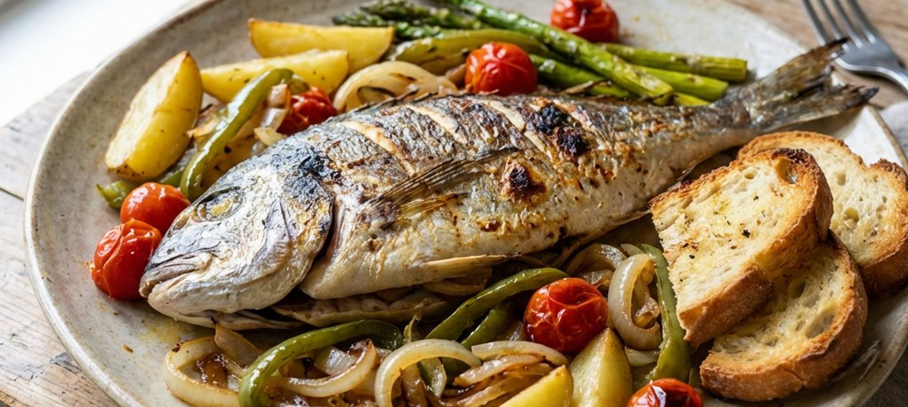 - 4Prăjiți feliile de ciabatta sau baghetă pe o tigaie uscată. Serviți peștele pe feliile de pâine prăjită, înconjurat de legume și sosul din tigaie.
