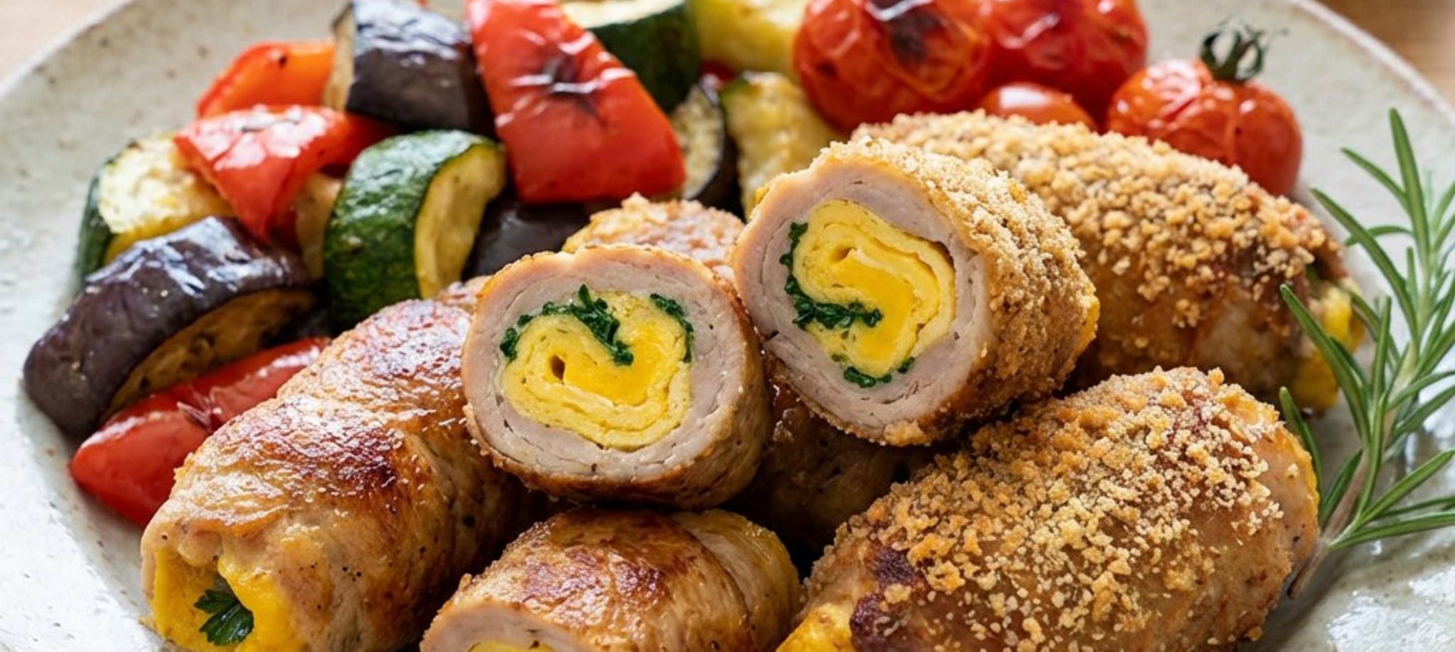 - 1Într-un bol, bateți ouăle cu un praf de sare și pregătiți o omletă subțire într'o tigaie întinsă. Pe feliile de antricot de vită, așezați succesiv bucăți de omletă, șuncă presată și frunze de pătrunjel rupte. Stropiți cu puțin ulei de măsline, sărați și rulați strâns. Fixați rulourile cu scobitori sau ace de metal pentru a nu se desface.