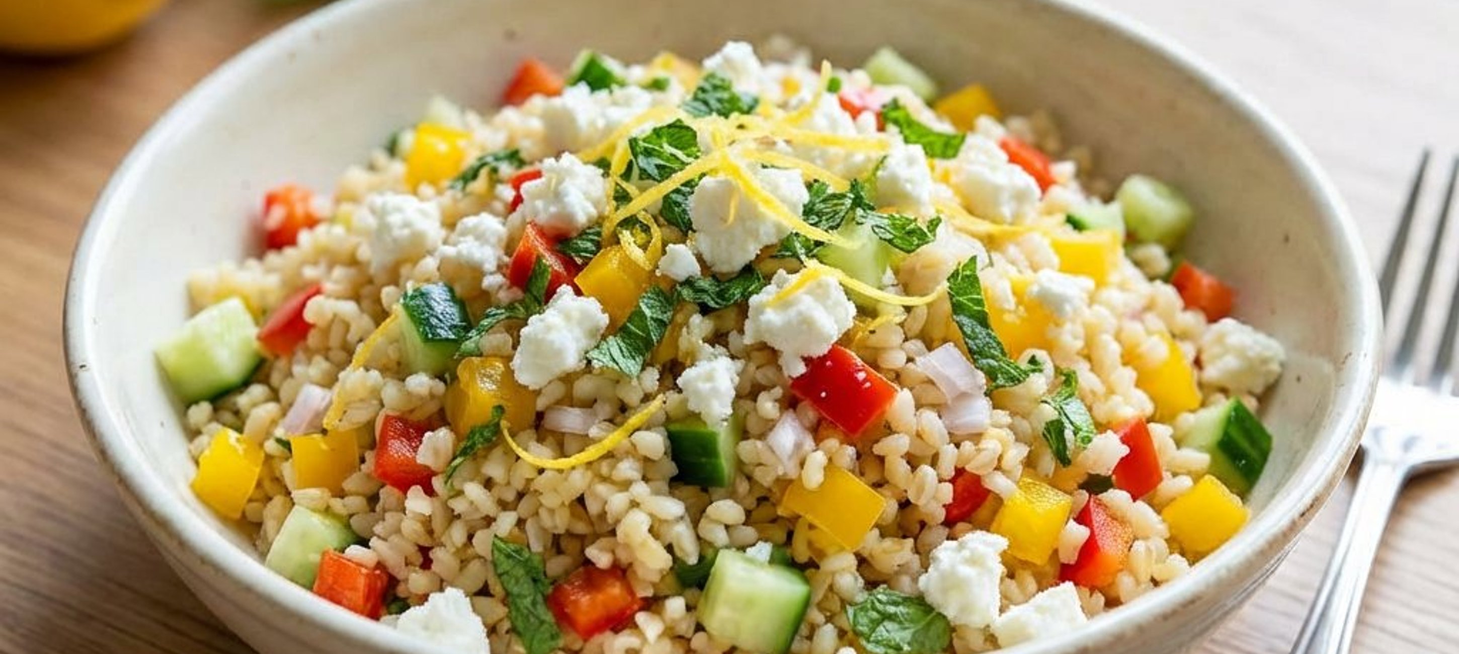 - 4Sfărâmați brânza feta în bolul cu bulgur și legume. Adăugați cele 2 linguri de ulei de măsline, coaja de lămâie rasă fin, sucul de lămâie, menta proaspătă tocată mărunt, sarea și piperul. Amestecați totul bine.
