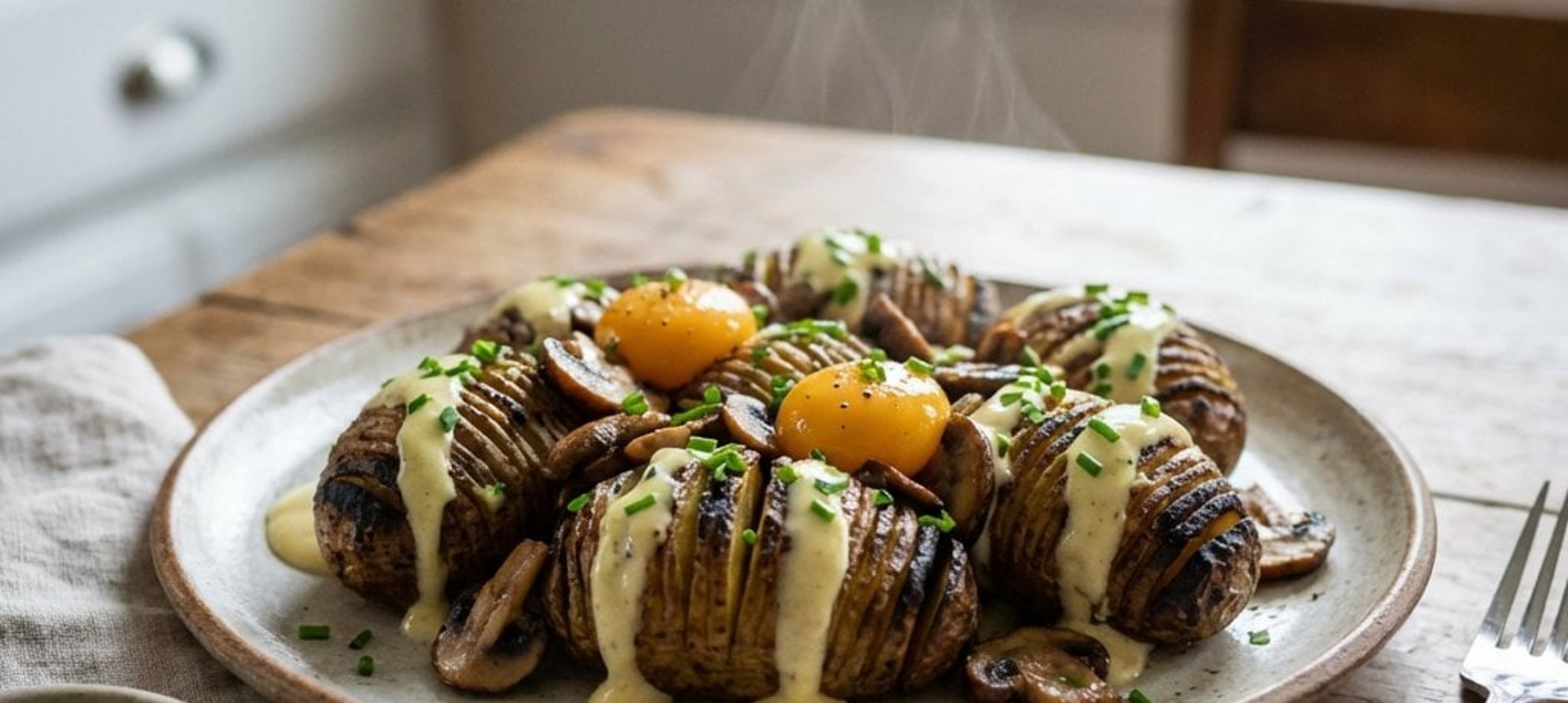 - 2Tocați mărunt arpagicul verde. Pentru servire, puneți mai întâi sosul pe farfurie, așezați cartofii "în cenușă" deasupra și presărați sare fulgi. Distribuiți uniform ciupercile sotate și gălbenușurile marinate (tăiate în sferturi). Garnisiți cu arpagic verde și jumări crocante. Finalizați cu câteva picături de ulei de trufe și un praf de piper alb.