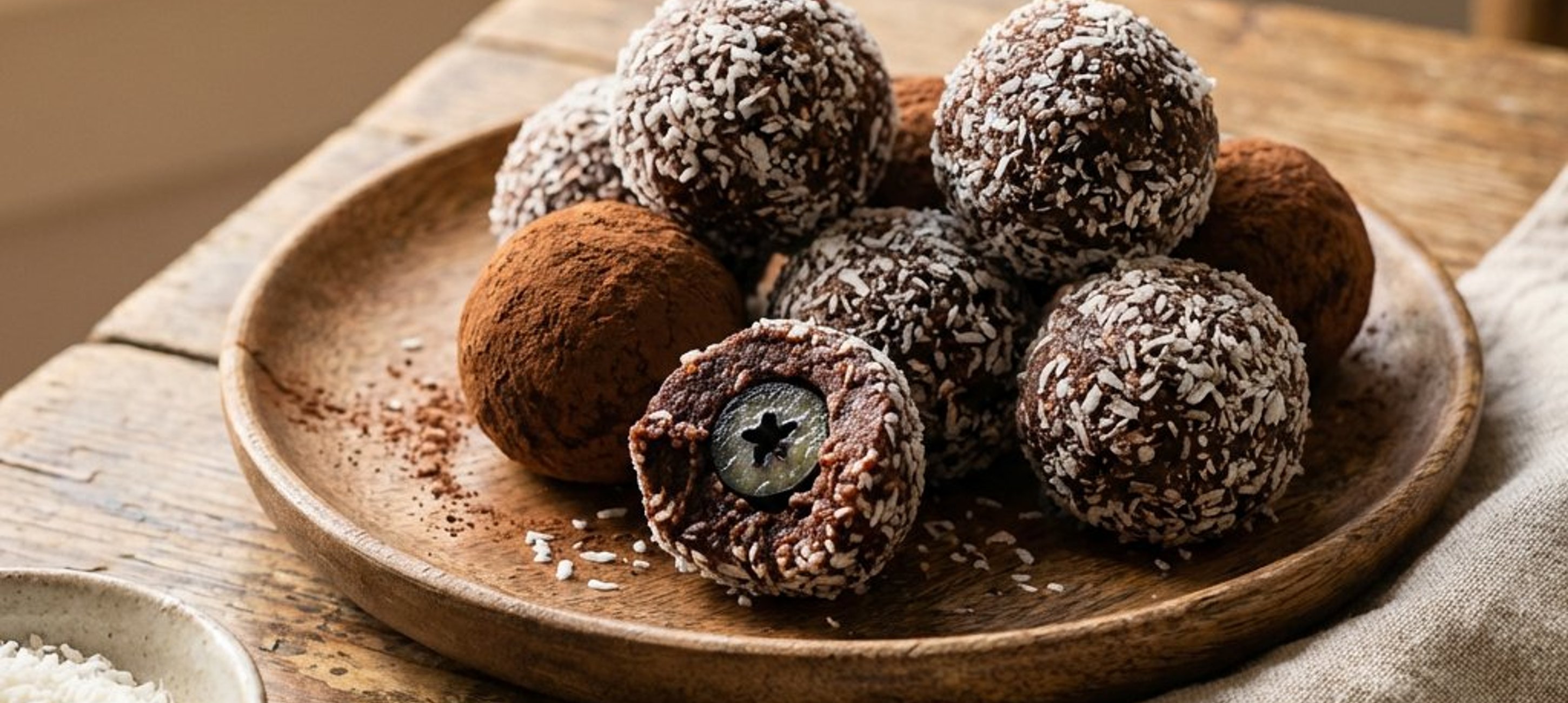 - 1După ce s-a răcit, luați mici porții din compoziție și formați discuri plate. Așezați în mijlocul fiecăruia o afină proaspătă sau o zmeură congelată. Modelați cu grijă sub formă de biluțe și treceți-le prin nuca de cocos răzuită până sunt acoperite uniform.