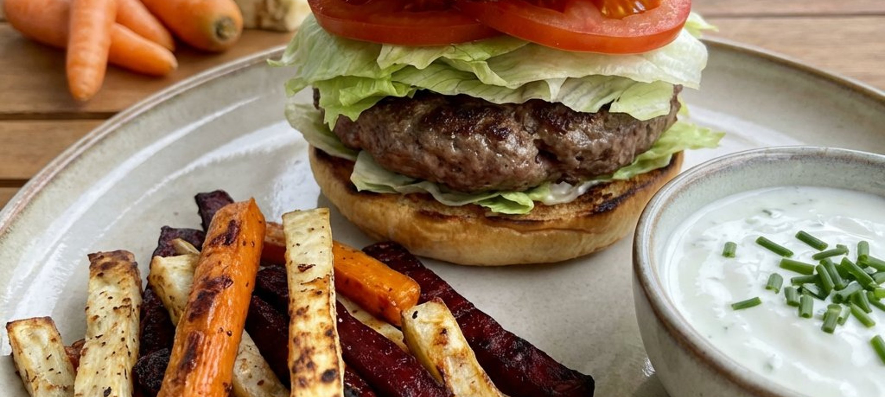 - 2Între timp, tăiați chiflele în jumătate și ungeți ambele părți cu dip-ul pregătit. Pe partea inferioară a fiecărei chifle, așezați o frunză de salată iceberg, 2 felii de roșie și burgerul odihnit. Acoperiți cu partea superioară a chiflei și serviți alături de cartofii de legume și extra dip.