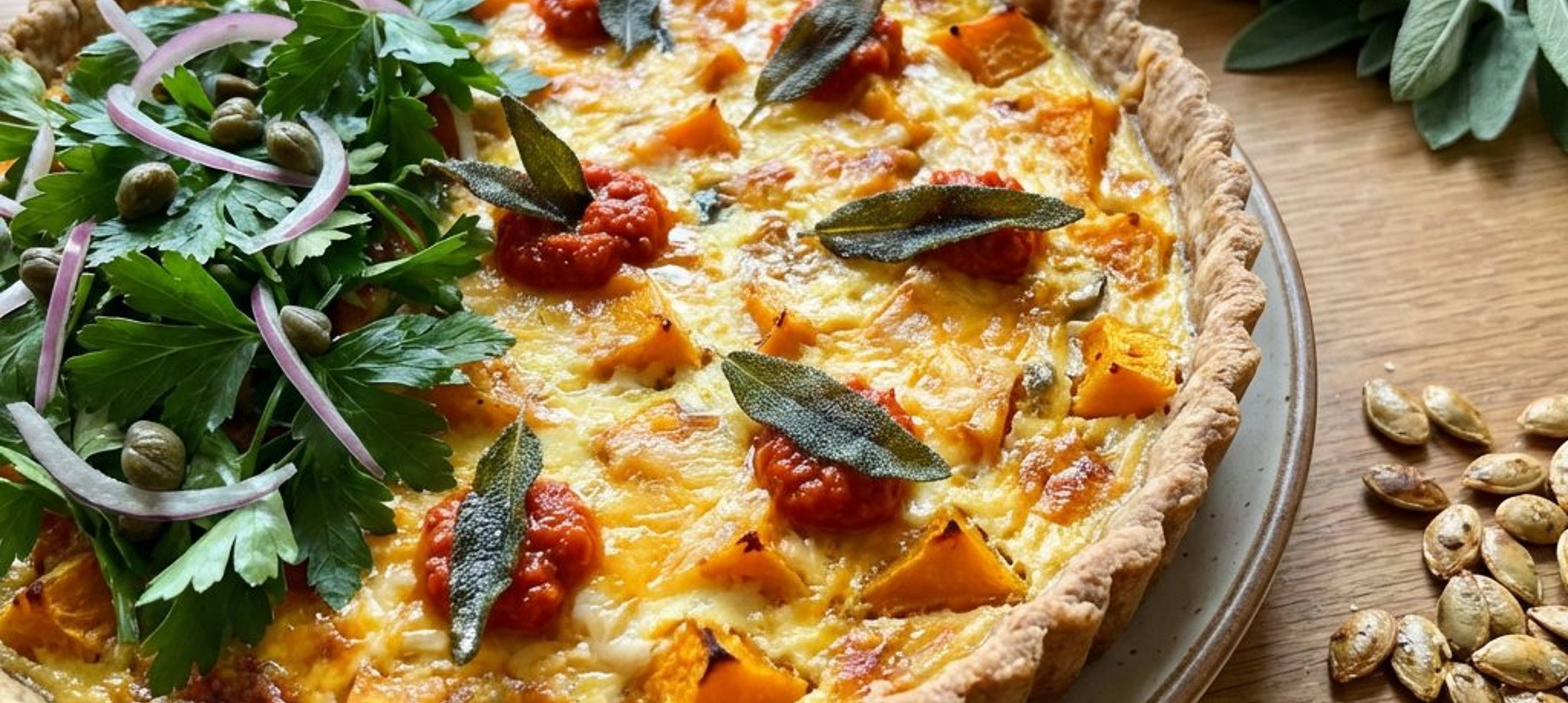- 3Tăiați marginile excedentare ale aluatului pre-copt. Distribuiți uniform cuburile de dovleac copt și baconul cu salvie. Turnați amestecul de ouă și smântână. Adăugați din loc în loc câte o jumătate de linguriță de ajvar și bucățele de brânză Cheddar. Presărați restul de brânză rasă deasupra și coaceți timp de 40-45 de minute, până când tarta devine aurie și umplutura este fermă.