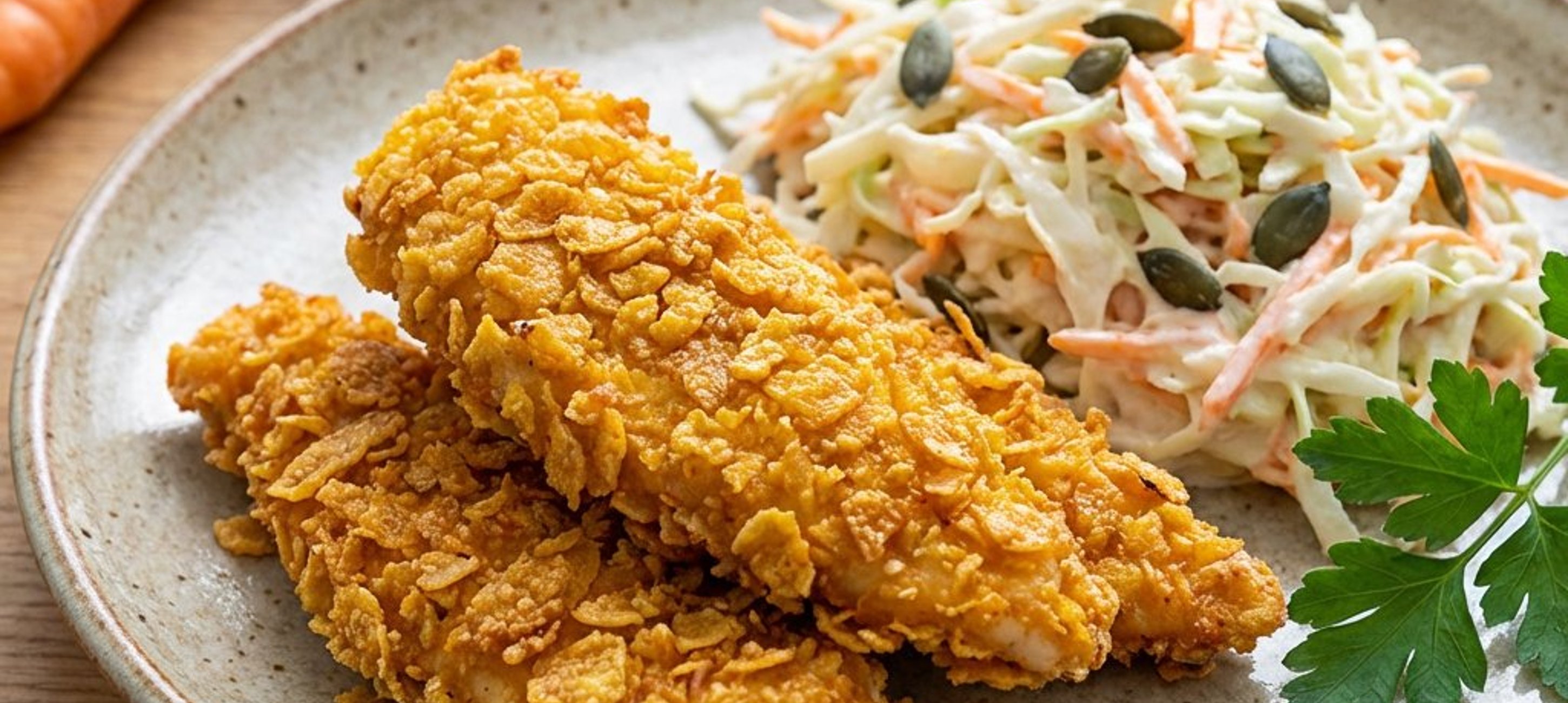 - 3Preîncălziți cuptorul la 180 °C. Pregătiți o tavă de copt și tapetați-o cu hârtie de copt. Zdrobiți fin fulgii de porumb. Scoateți puiul din frigider, treceți fiecare fâșie prin fulgii de porumb zdrobiți și așezați-le pe tavă.