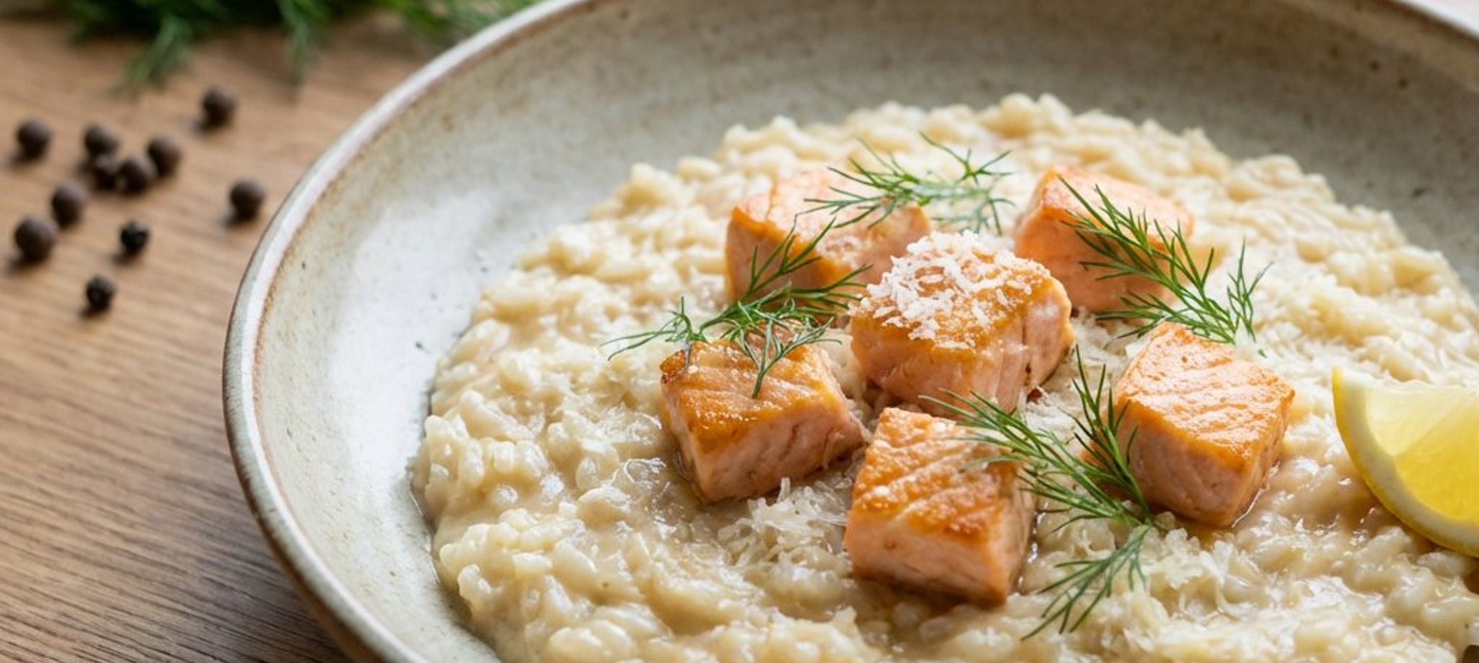 - 5Servește risotto-ul cald, așezând deasupra cuburile de somon rumenit și decorând cu crenguțe de mărar proaspăt.