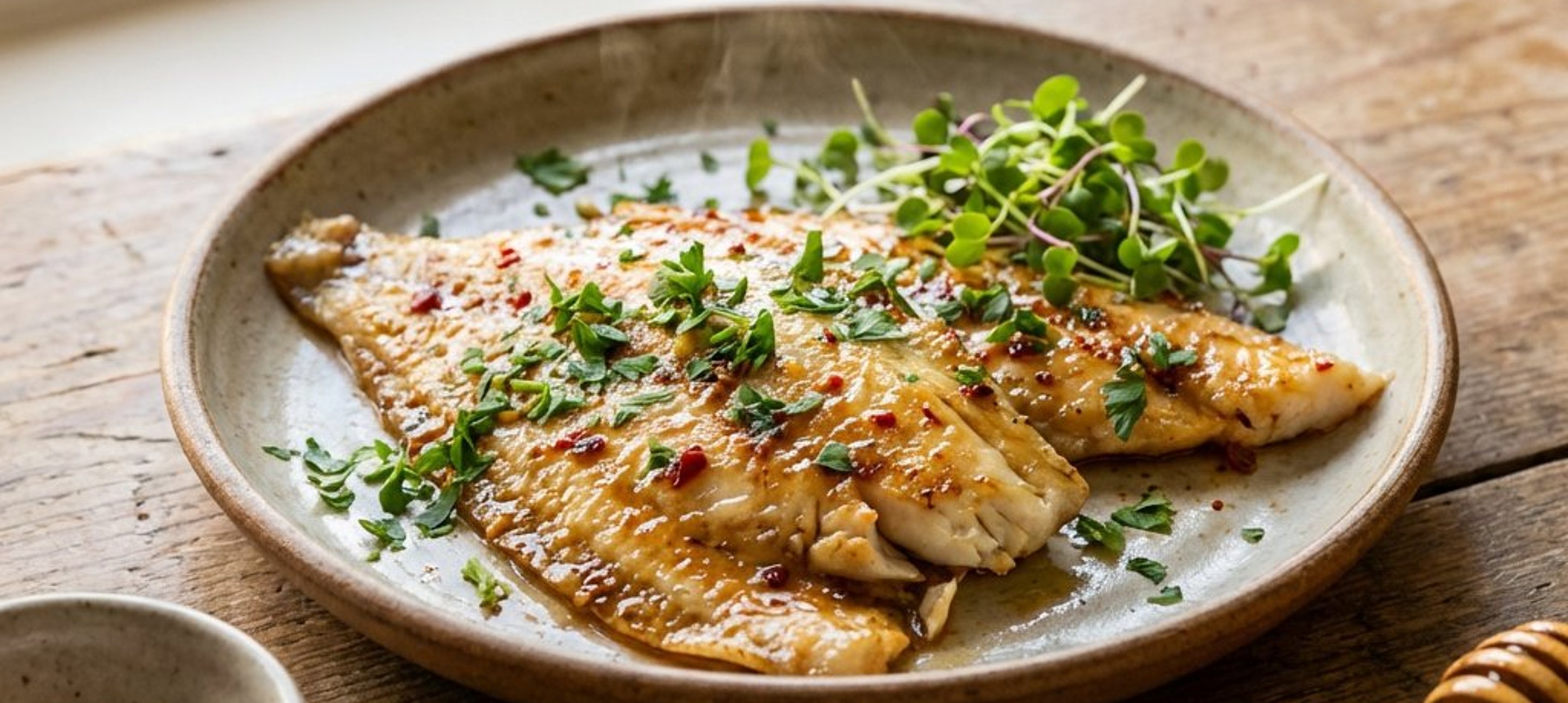 - 5Servește fileurile de platnică stropite din abundență cu glazura aromată și decorate cu germeni proaspeți de muștar.