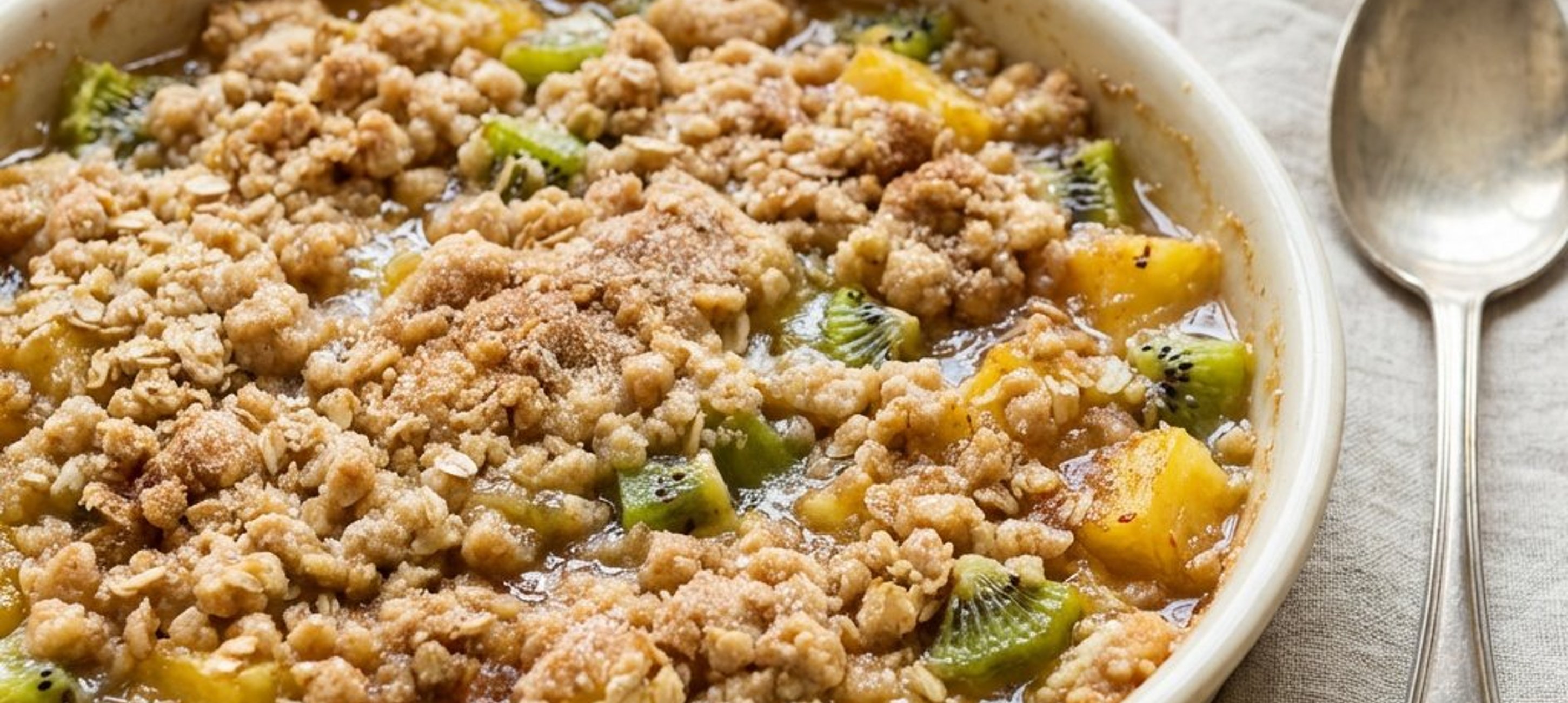 Pentru un plus de răsfăț, servește acest crumble cald, alături de o cupă de înghețată de vanilie sau puțină smântână grasă. Sucul lăsat de fructe în timpul coacerii va crea un sos delicios la baza tăvii.