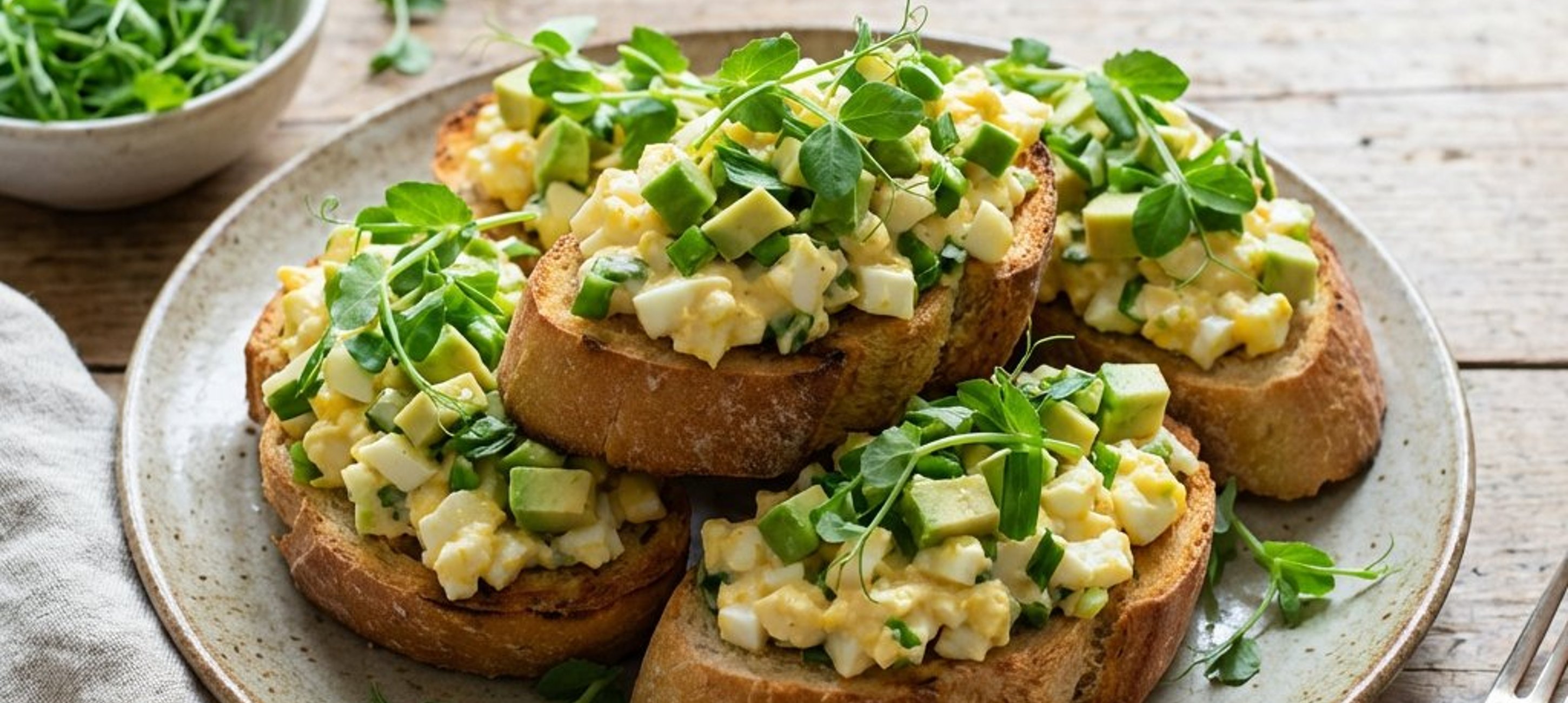 - 2Prăjiți feliile de baghetă până devin crocante, stropiți-le cu uleiul de măsline aromatizat și serviți-le cu salata proaspătă de ouă, decorând cu microplante de mazăre.