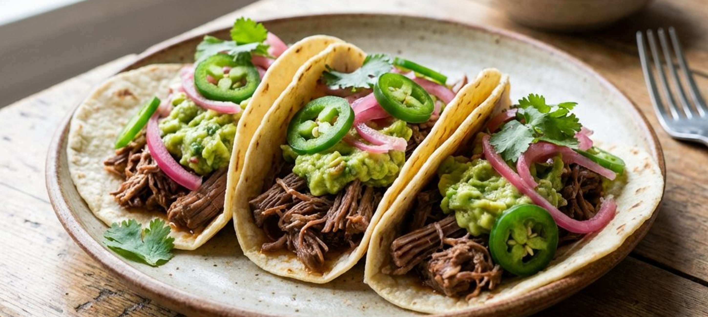 - 2Ungeți taco shells sau tortilla cu un strat generos de guacamole. Adăugați deasupra carnea de vită fragedă.