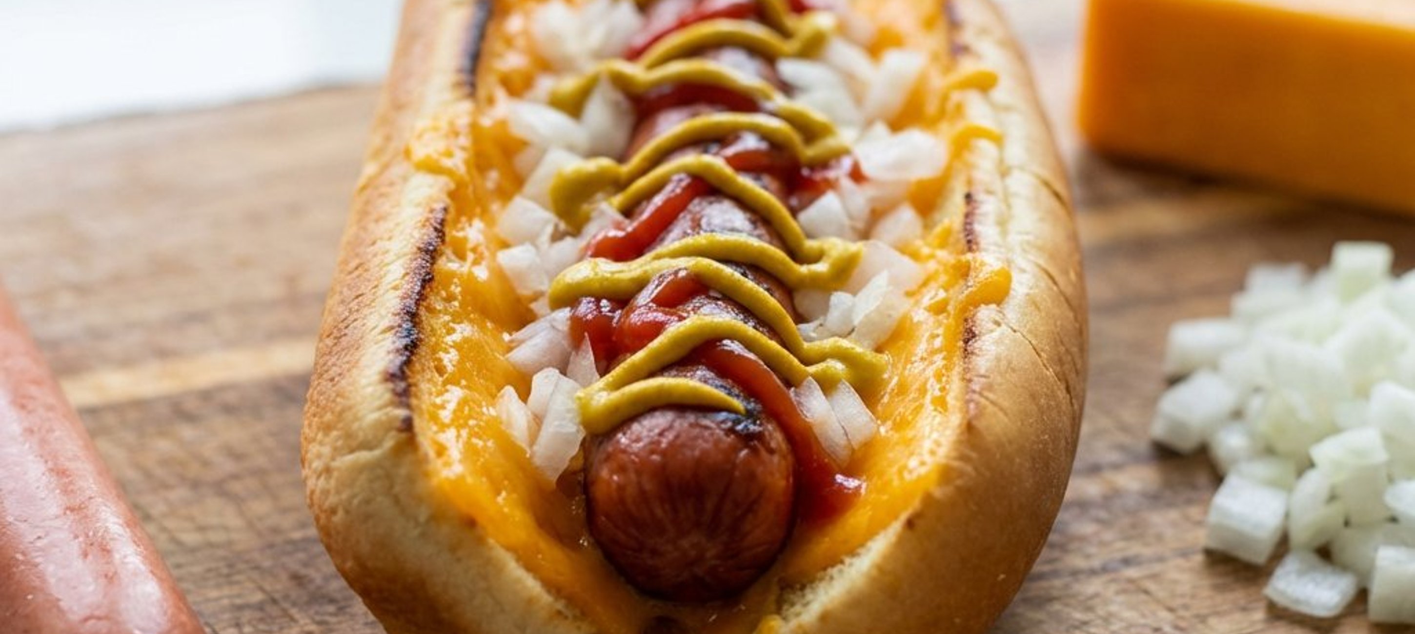 - 5Asamblați hot dog-ii: puneți câte un crenvurst în fiecare chiflă caldă. Presărați din abundență brânză cheddar și ceapă tocată. Adăugați ketchup și muștar după gust.