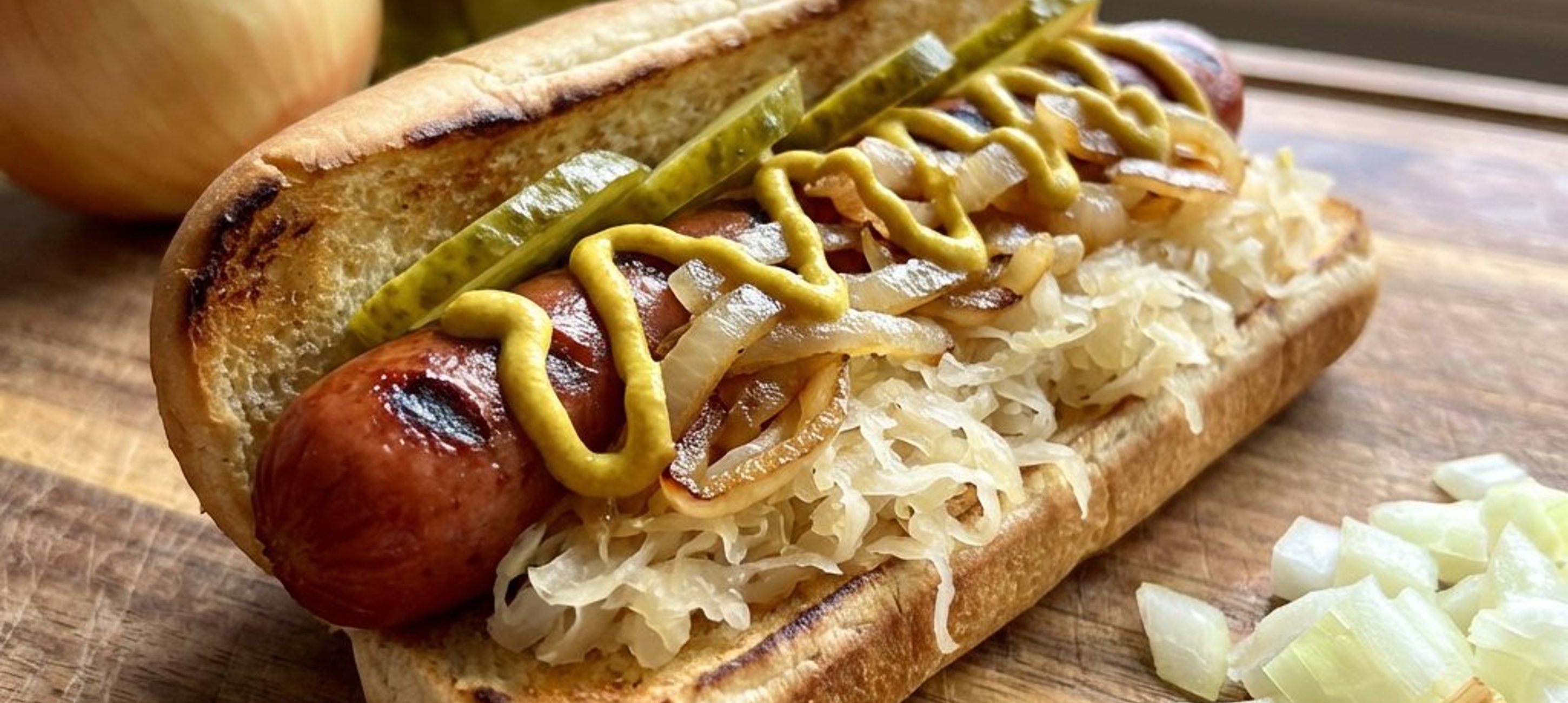 - 3Pune crenvurștii în chiflele calde. Adaugă deasupra amestecul de varză murată și ceapă, apoi completează cu muștar și felii de castraveți murați după preferință.