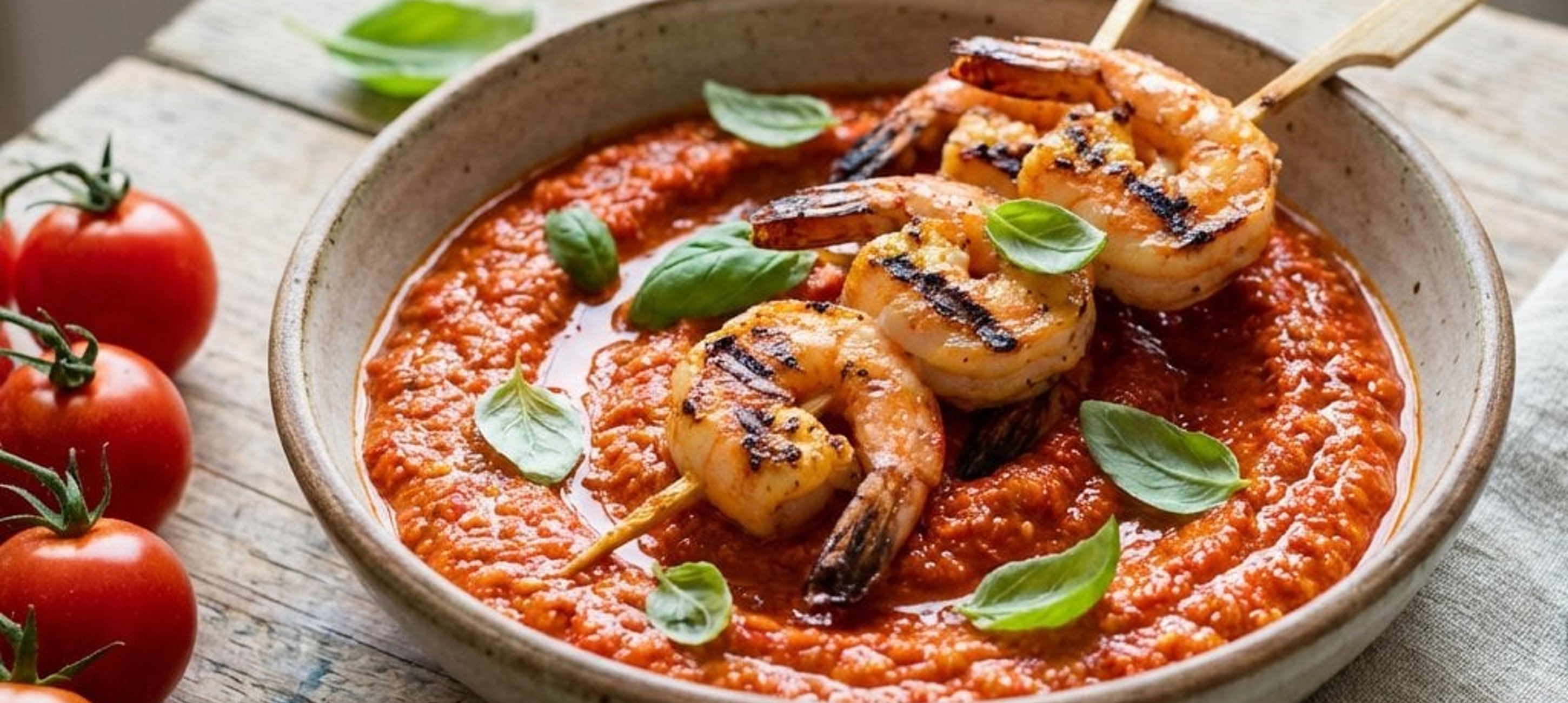 - 2Pregătiți creveții curățați sub formă de frigărui. Condimentați-i cu sare, piper și stropiți-i cu ulei de măsline. Frigeți-i scurt pe grătarul încins pe ambele părți. Creveții sunt gata când culoarea lor se schimbă din gri în alb-rozaliu. Nu îi lăsați prea mult pe foc pentru a nu se usca.