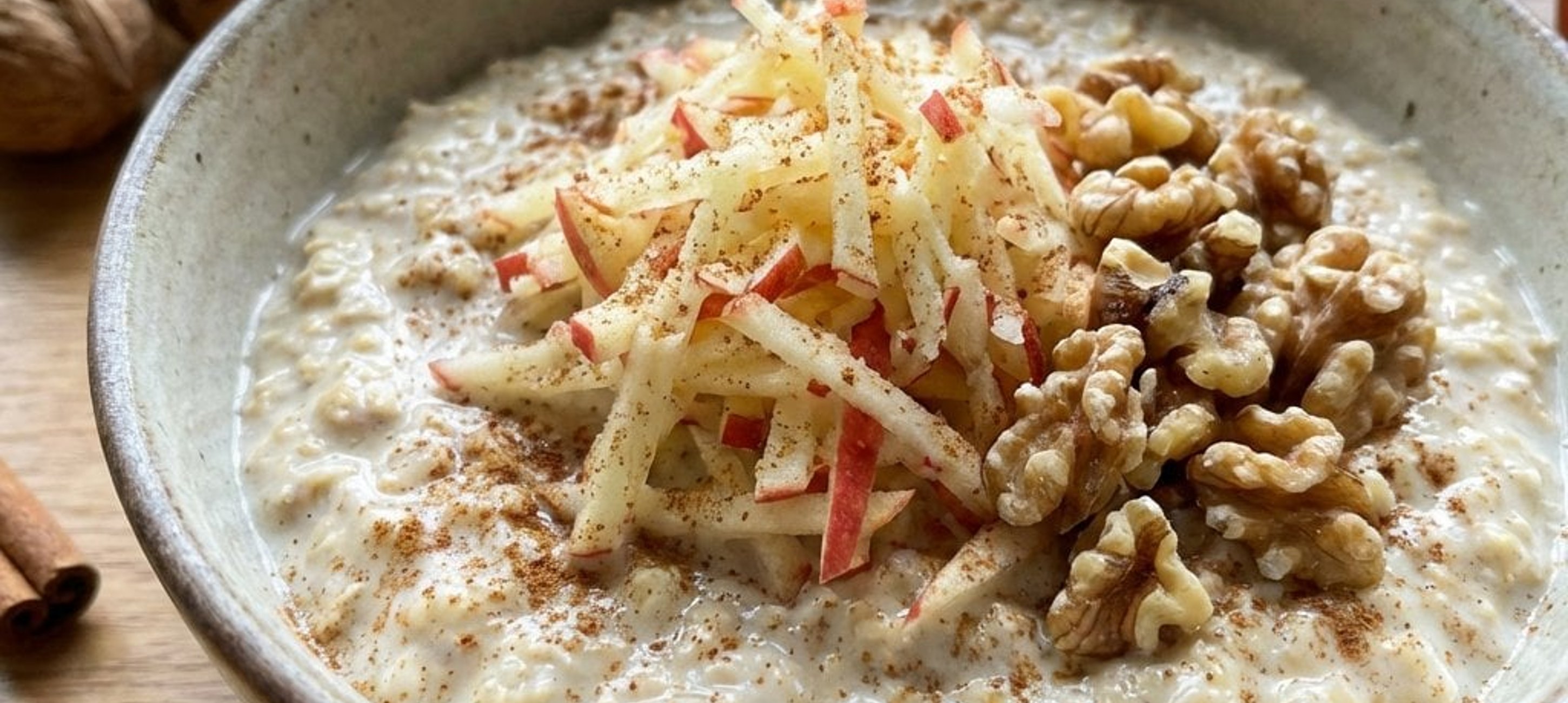 - 2Într-un bol încăpător, amestecă mărul ras, nucile tocate și restul ingredientelor: fulgii de ovăz, iaurtul, laptele, stafidele și scorțișoara. Omogenizează bine compoziția.