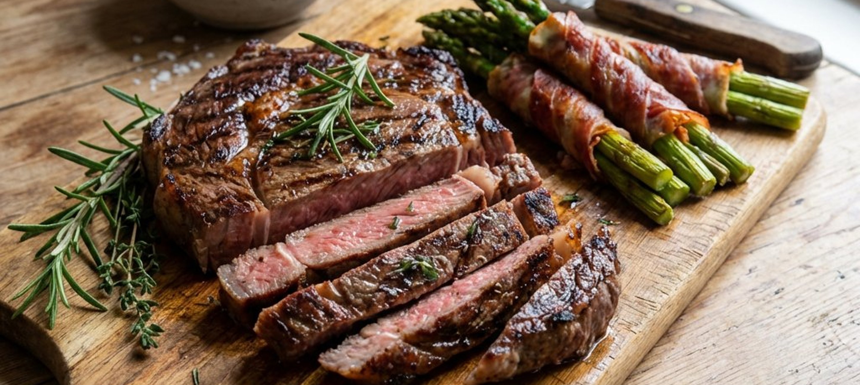 - 1Masează steak-ul de vită cu ulei de măsline și ierburile aromatice tocate (cimbru, rozmarin, măghiran). Condimentează cu piper pe ambele părți. Lasă carnea să se odihnească la temperatura camerei. Între timp, opărește sparanghelul timp de 3 minute în apă clocotită, apoi răcește-l imediat în apă cu gheață. Învelește câte 5 fire de sparanghel într-o felie de prosciutto.