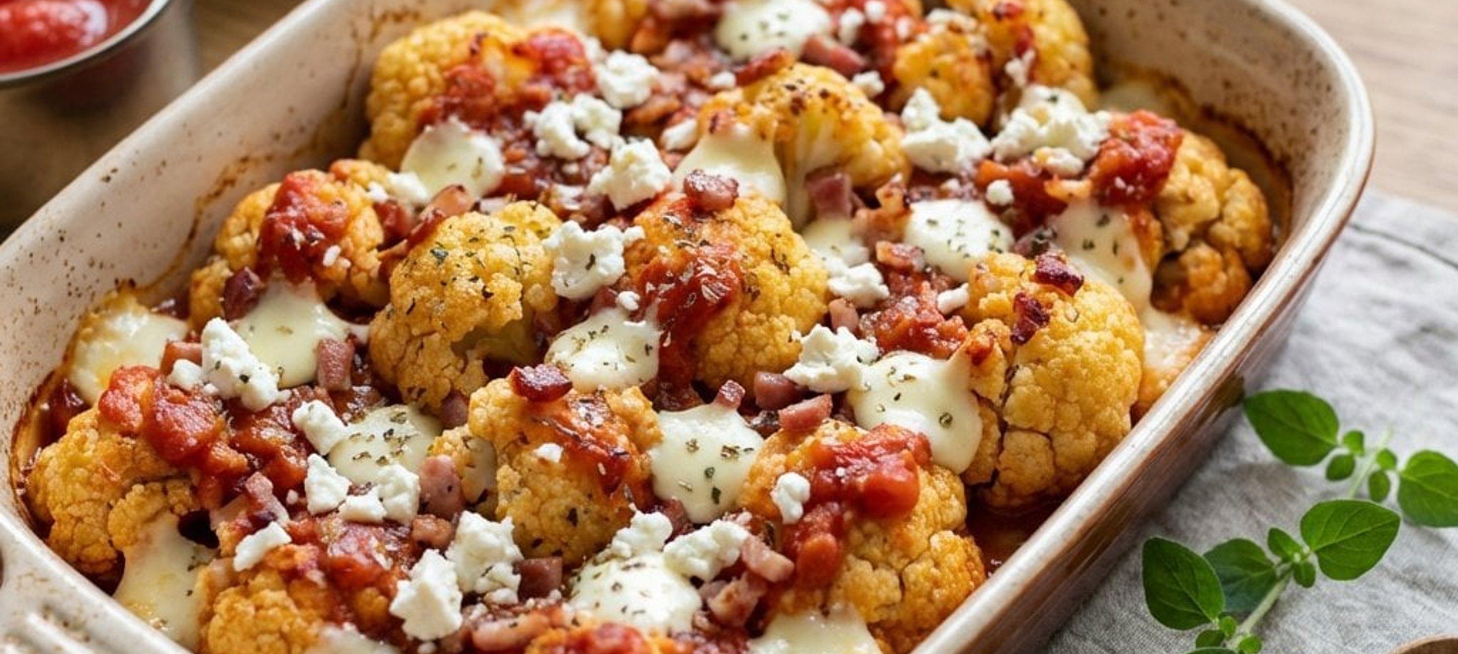 - 5Puneți amestecul de conopidă în vasul de copt, peste baconul rumenit, amestecați bine și coaceți totul timp de 16–17 minute la 220–225 °C.