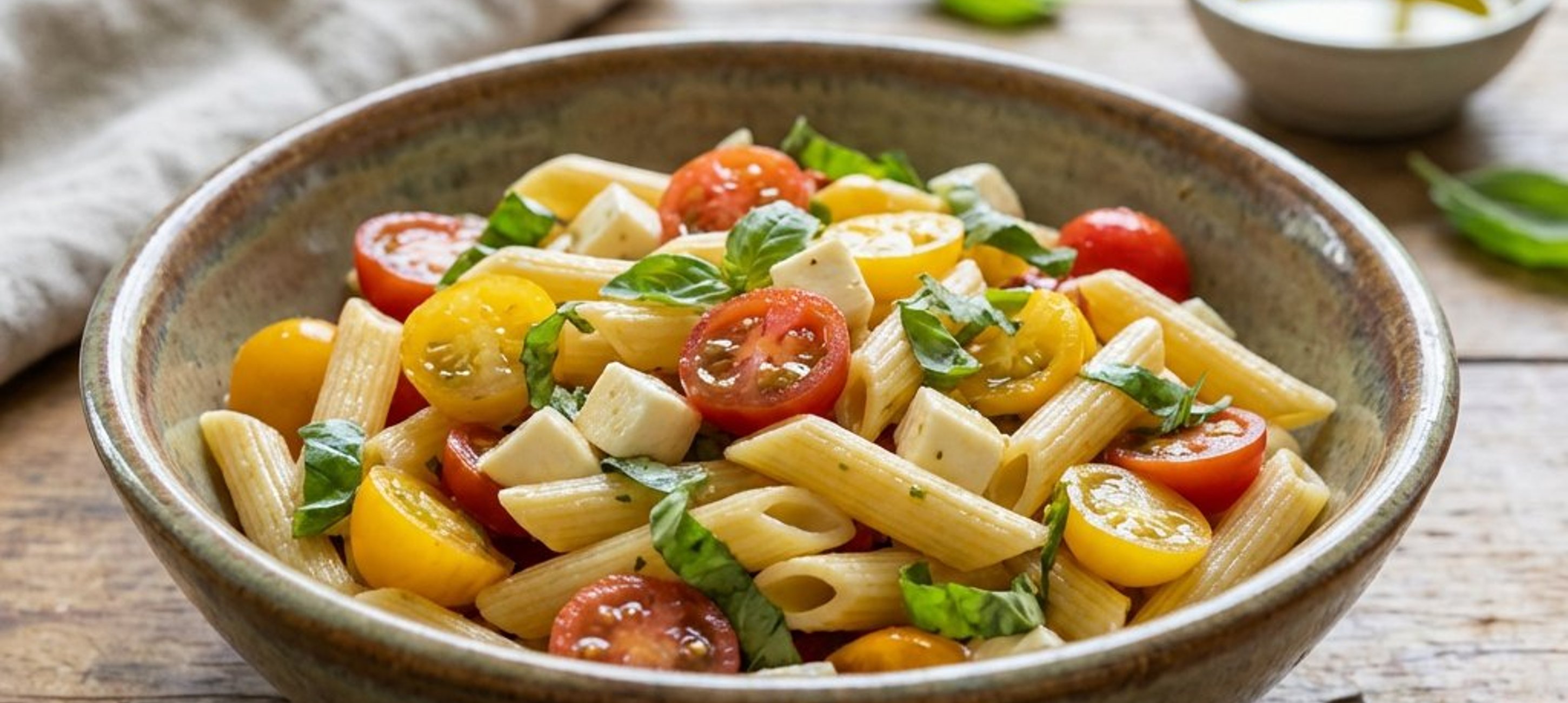 - 1Într-o oală mare, aduceți la fierbere 2 litri de apă pentru paste. Între timp, spălați roșiile cherry și tăiați-le în jumătăți. Tăiați mozzarella în cubulețe și tocați grosier frunzele de busuioc. Puneți-le pe toate într-un bol încăpător.