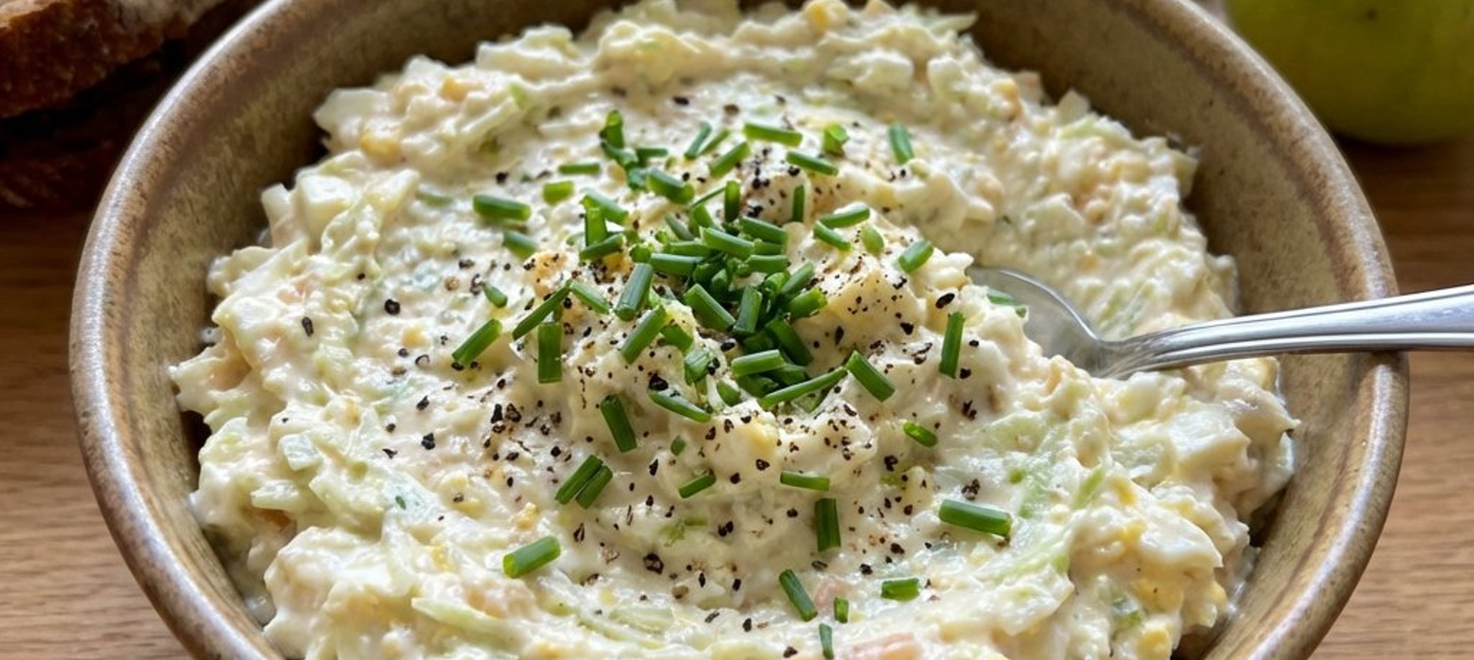 - 3Într-un bol de mărime medie, amestecați țelina rasă, mărul, ouăle, crema de brânză, muștarul de Dijon și sucul de lămâie. Omogenizați bine compoziția.