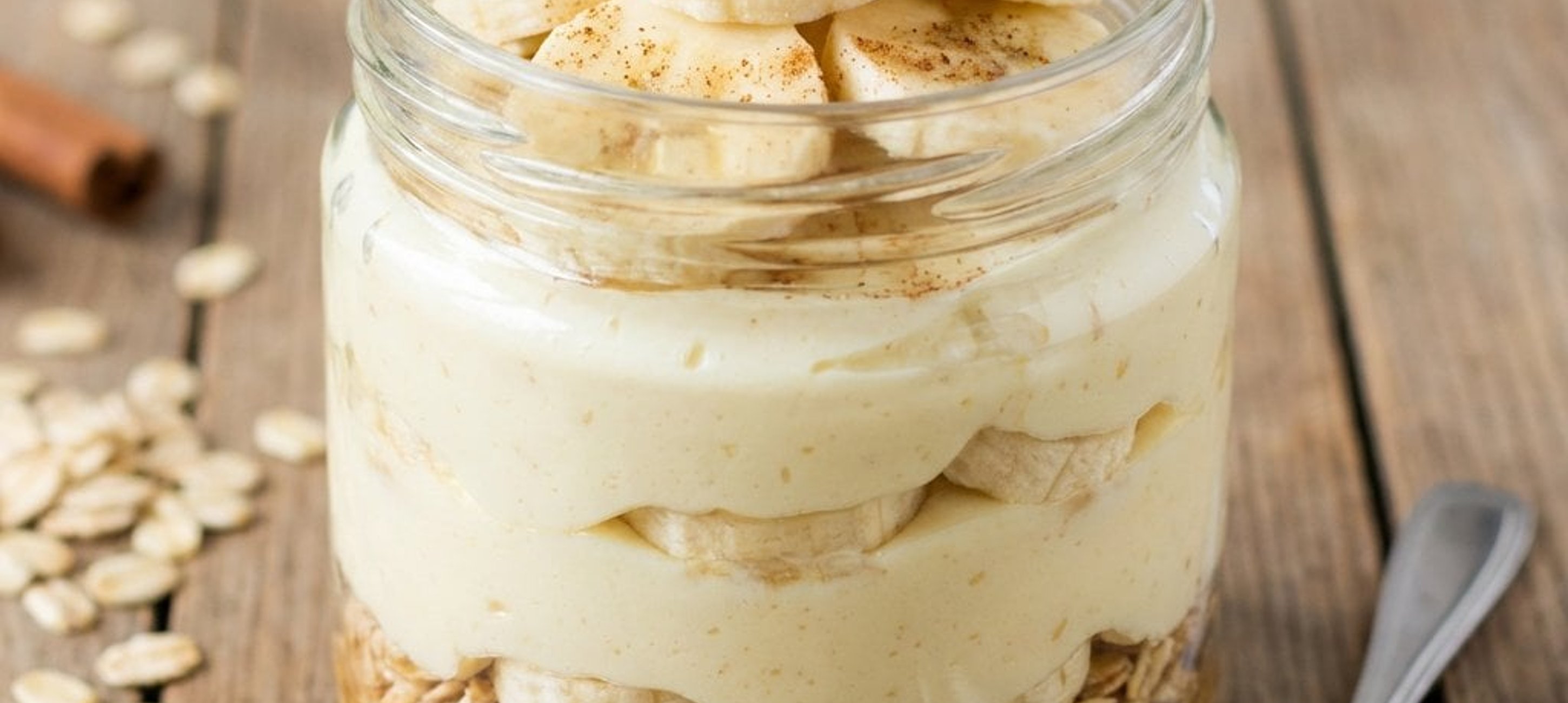 - 1Scoateți budinca răcită din frigider, îndepărtați folia și amestecați-o scurt cu telul. Puneți jumătate din cantitatea de budincă în pahare, peste stratul de ovăz. Adăugați jumătate din rondelele de banane. Repetați procesul cu restul de budincă și finalizați cu rondelele de banane rămase deasupra.