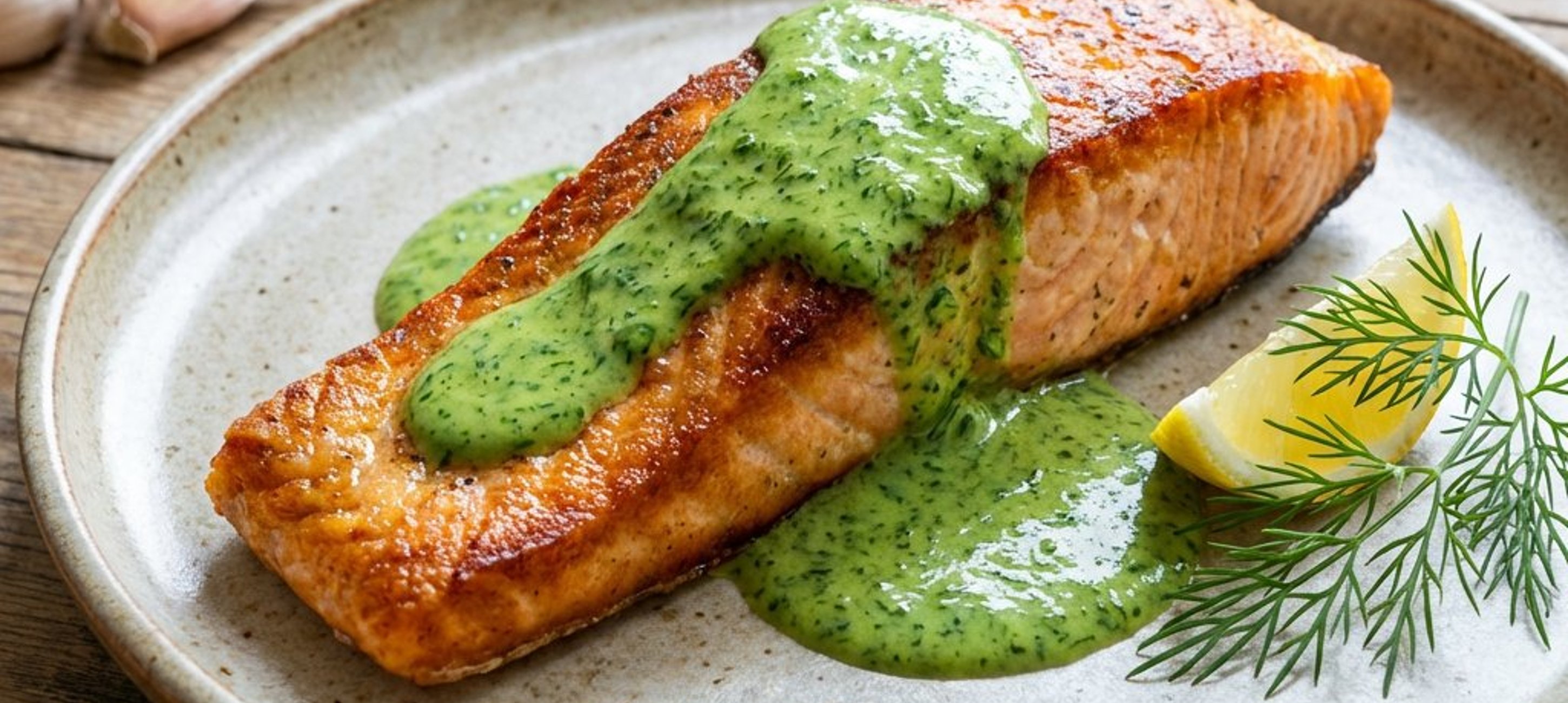 - 4După ce somonul este gata, porționați-l și serviți-l imediat alături de sosul de pătrunjel pregătit.
