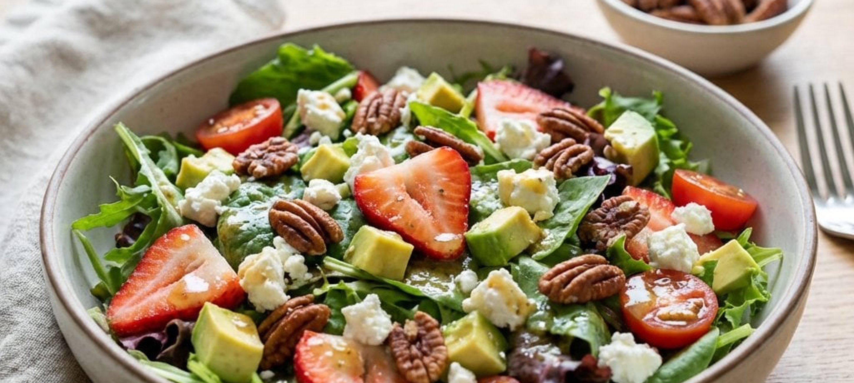 - 1Într-un bol mare, puneți mixul de salată verde împreună cu legumele pregătite, căpșunile și o parte din brânza feta. Pregătiți dressingul amestecând bine uleiul de măsline, oțetul de vin roșu, mierea și sarea. Turnați dressingul peste salată și amestecați ușor. Distribuiți salata în boluri individuale și presărați deasupra restul de brânză feta și nucile pecan. Serviți imediat.