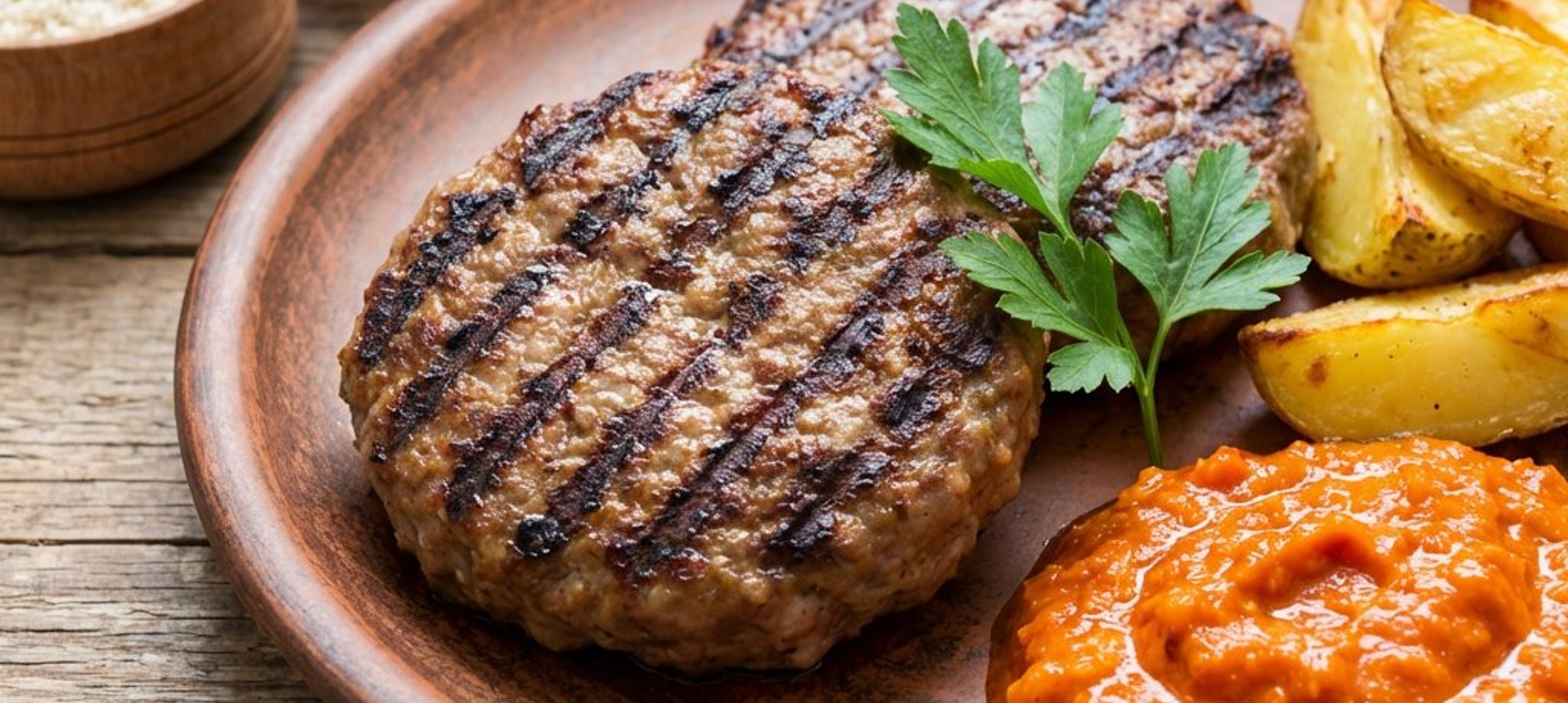 Pentru o pljeskavica și mai suculentă, poți adăuga puțină apă minerală carbogazoasă în compoziția de carne. Servește-o fierbinte, alături de o porție generoasă de ajvar și ceapă roșie tăiată peștișori.