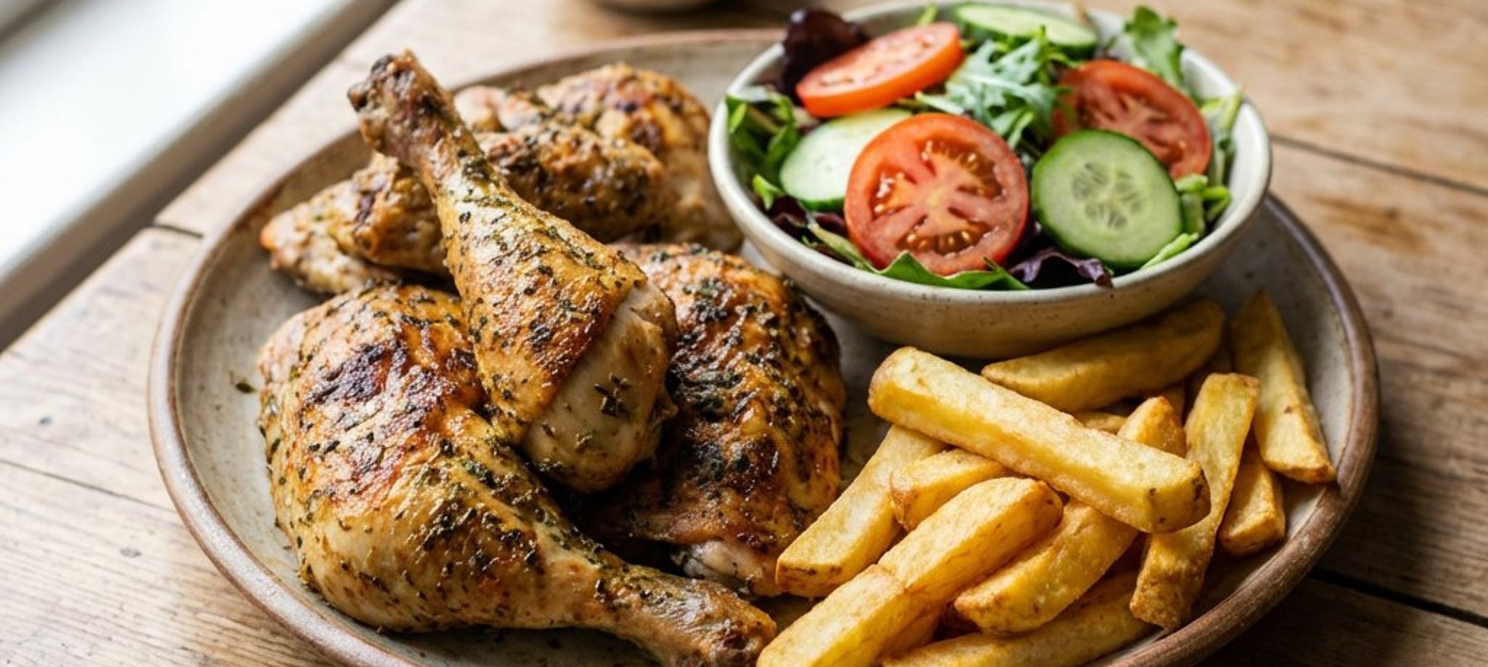 - 3Când puiul este gata, porționează-l (de obicei în sferturi) și servește-l alături de cartofii prăjiți crocanți și salata proaspătă.
