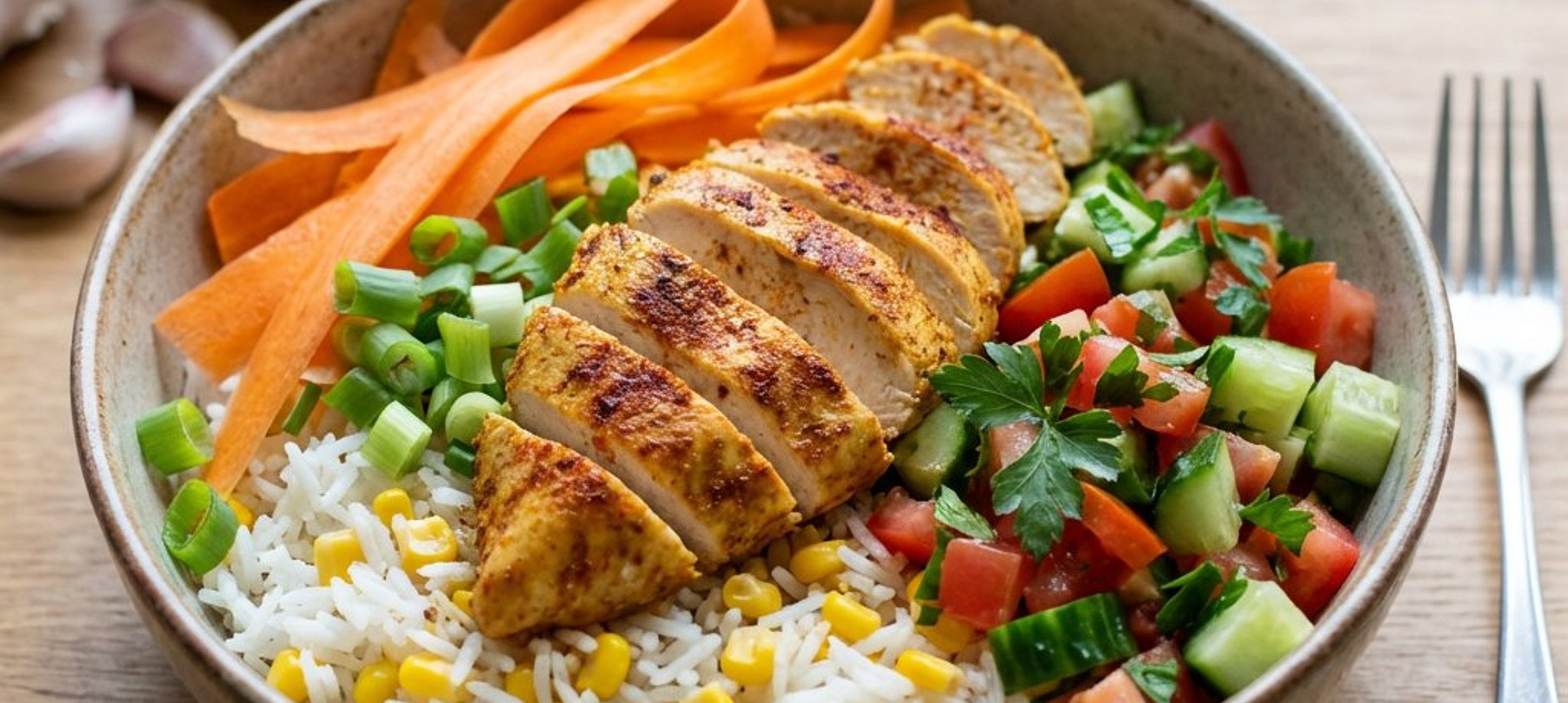 - 2Pregătiți două boluri și împărțiți în ele orezul cu porumb. Așezați deasupra feliile de pui, fâșiile de morcov, ceapa verde și amestecul de roșii cu castravete. Serviți imediat.