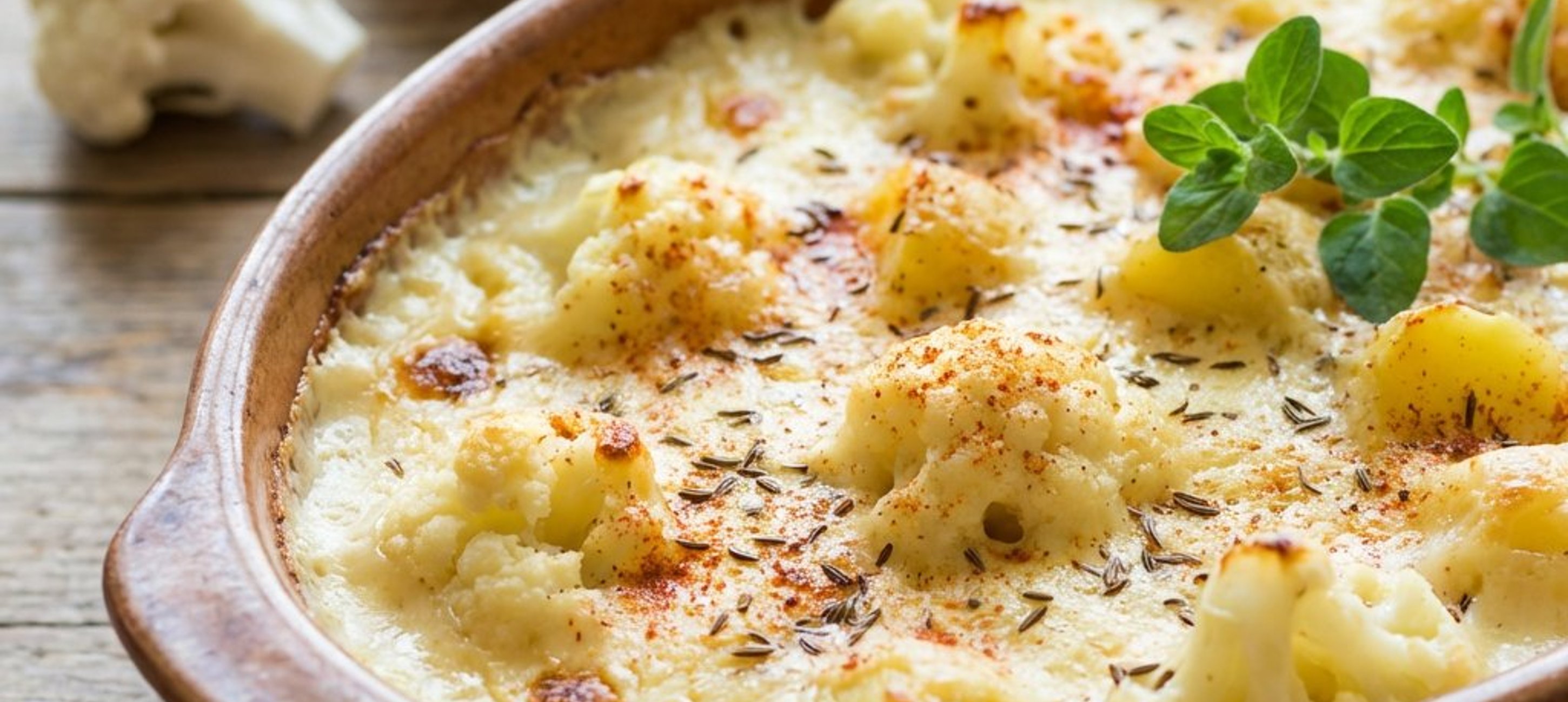 - 5După expirarea timpului, scoateți tava din cuptor, porționați conopida gratinată în 4 porții și serviți caldă.