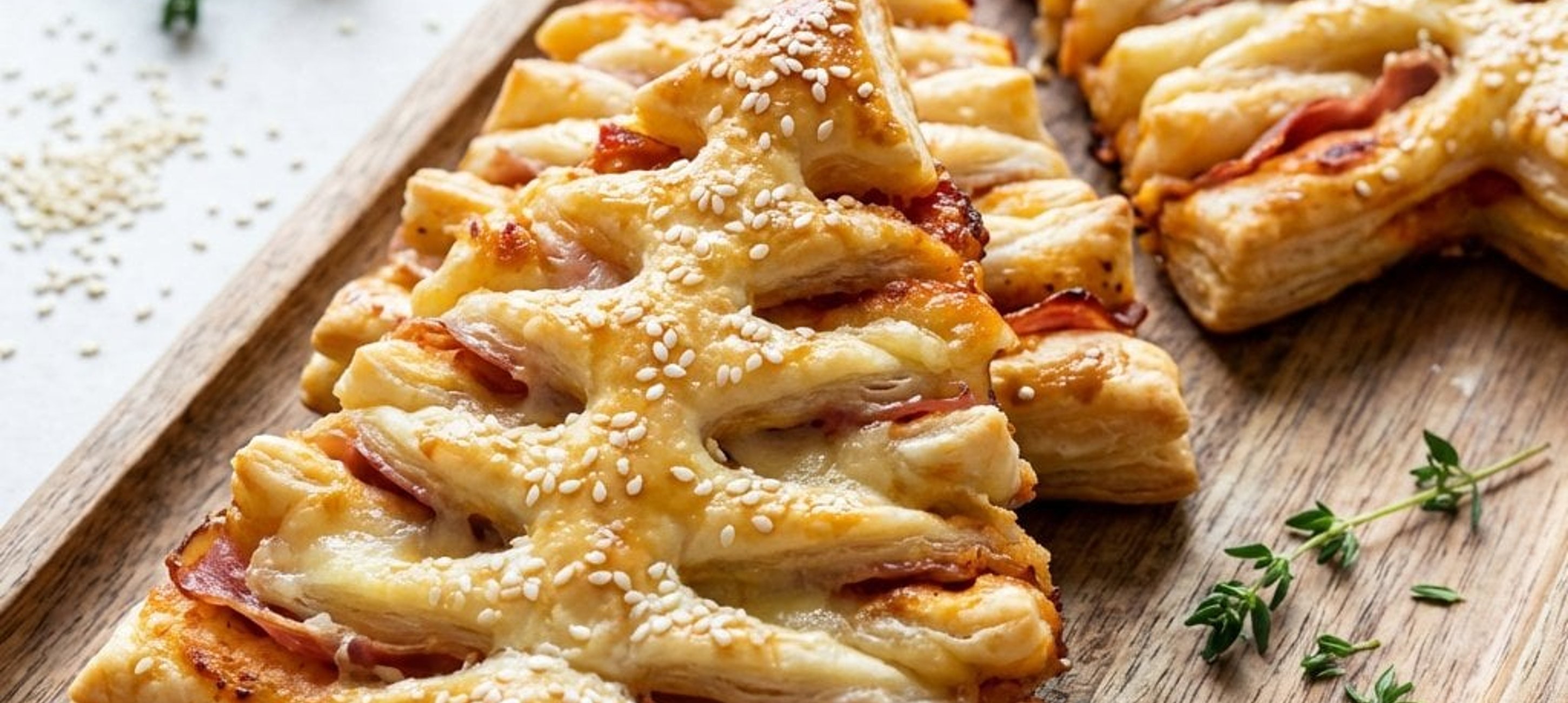 - 2Pe fiecare pătrat de aluat (cu excepția celui mai mic, care va fi vârful), așezați o bucată mică de prosciutto crudo, o felie de brânză Emmental și puțin pesto de roșii uscate. Suprapuneți pătratele rotindu-le ușor pentru a crea aspectul de ramuri de brad și fixați totul în centru cu o frigăruie de lemn.