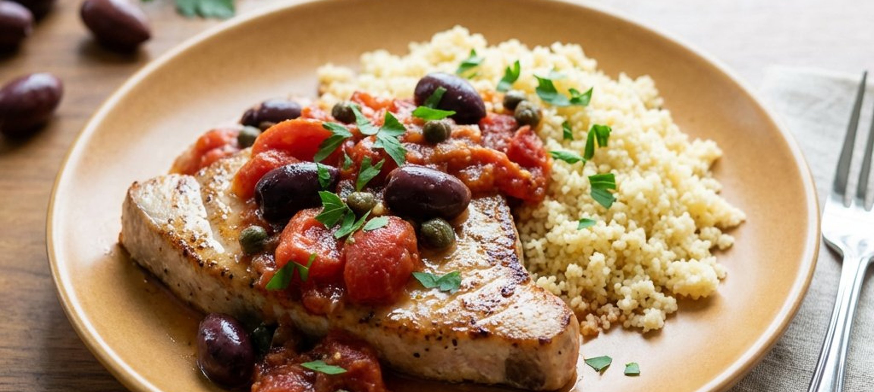 - 5Serviți imediat peștele-spadă alături de cuscusul pufos, sosul de roșii și garnisiți cu pătrunjel verde proaspăt tocat și o felie de lămâie.