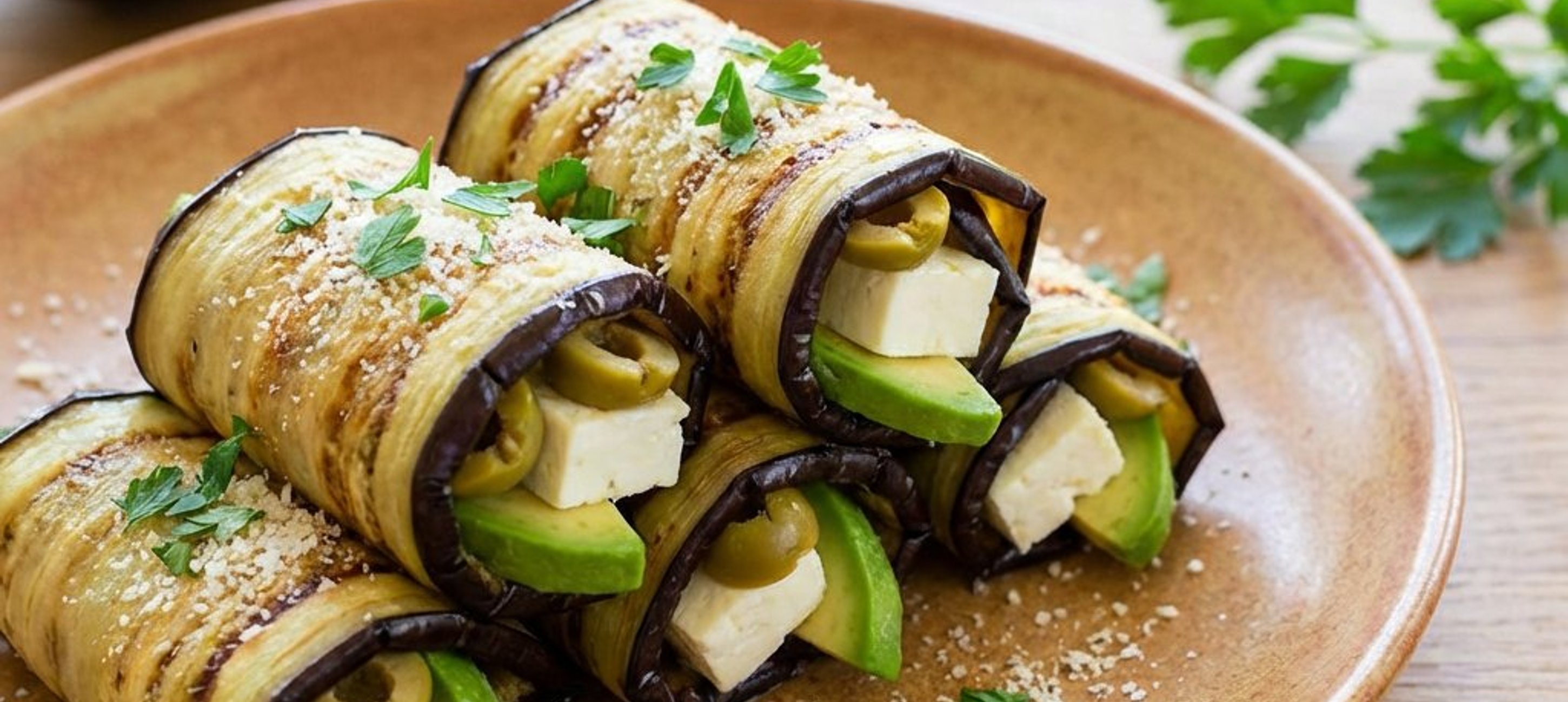- 2Pe fiecare felie de vânătă prăjită, așază un bastonaș de brânză feta, o felie de avocado și jumătăți de măsline. Rulează strâns. Presară rulourile gata formate cu parmezan ras și pătrunjel verde tocat mărunt. Poți servi rulourile imediat sau le poți introduce la cuptor sub grill pentru 2 minute pentru a se topi brânza.
