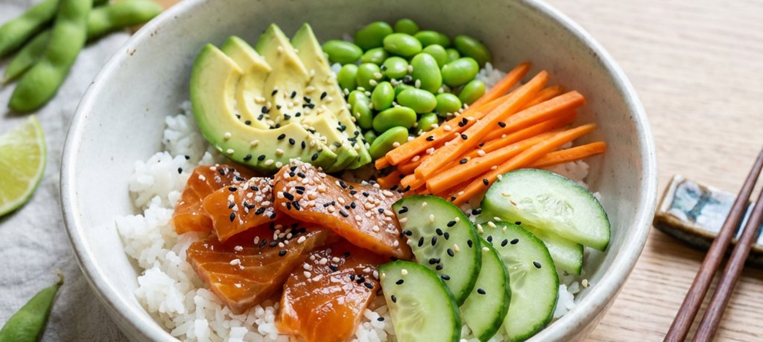 - 2Împarte orezul în două boluri. Aranjează deasupra „somonul” marinat, legumele pregătite și boabele de edamame. La final, presară semințele de susan și stropește totul cu restul de marinadă rămasă. Servește imediat.