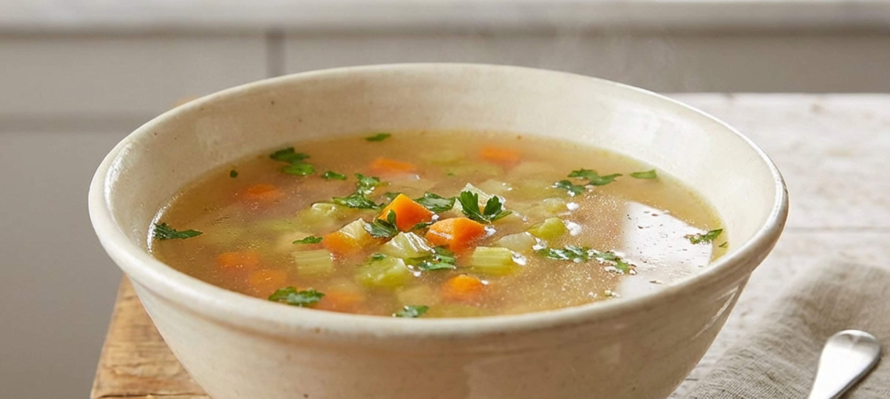 - 6Strecurați supa gata preparată printr-o sită fină și, dacă este necesar, fierbeți-o în continuare până când scade la un volum de aproximativ 3 litri. După ce supa s-a răcit, îndepărtați grăsimea de la suprafață.