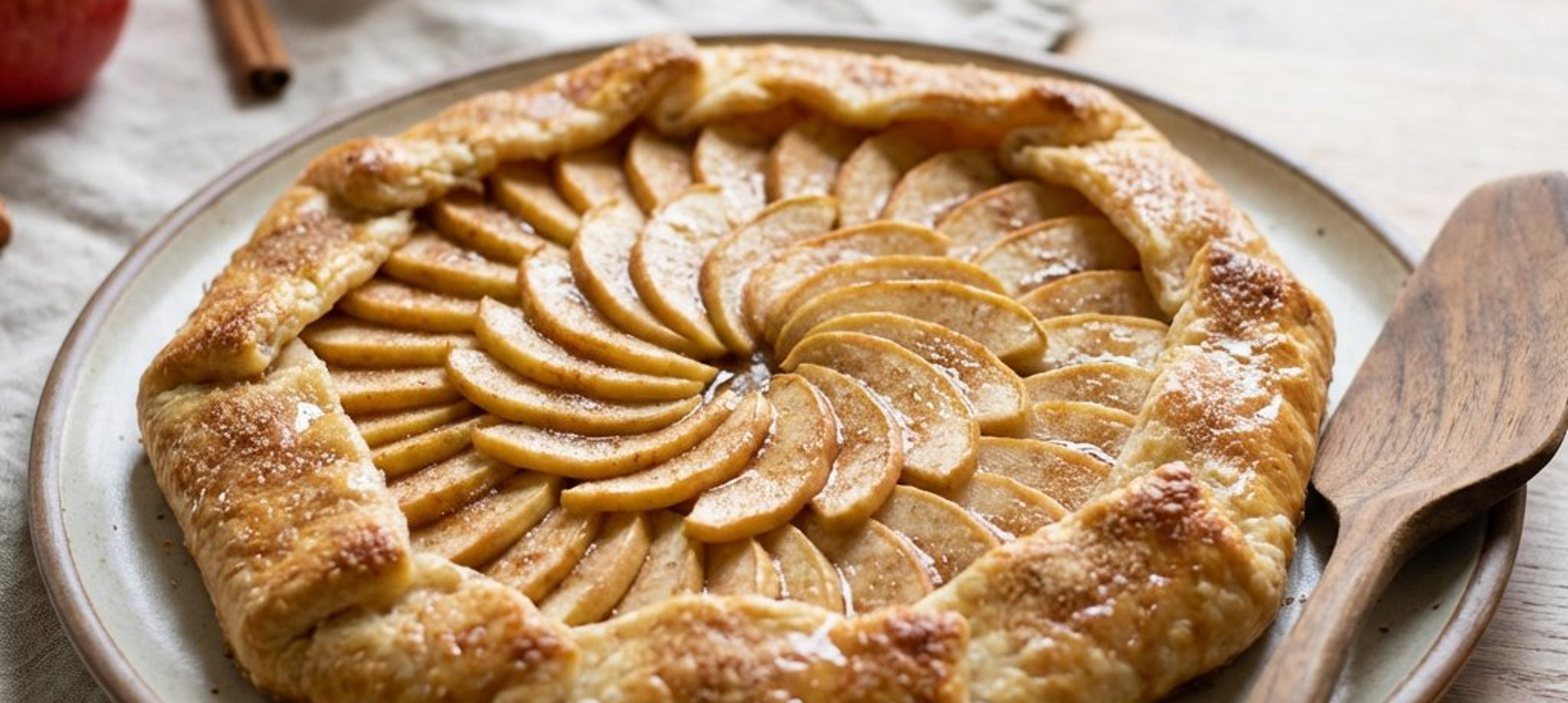 - 2După ce aluatul s-a odihnit, pregătiți merele. Curățați-le de coajă, îndepărtați cotorul și tăiați-le în felii subțiri (semilune). Puneți-le într-un bol și amestecați-le cu jumătate din cantitatea de zahăr brun și scorțișoara. Preîncălziți cuptorul la 180 °C și pregătiți o tavă mare de copt. Întindeți aluatul direct pe o bucată de hârtie de copt presărată cu puțină făină, formând un cerc neregulat cu o grosime de aproximativ 0,5 cm. Marginile nu trebuie să fie perfecte, aspectul rustic fiind specific acestui desert. Mutați aluatul cu tot cu hârtie în tavă.