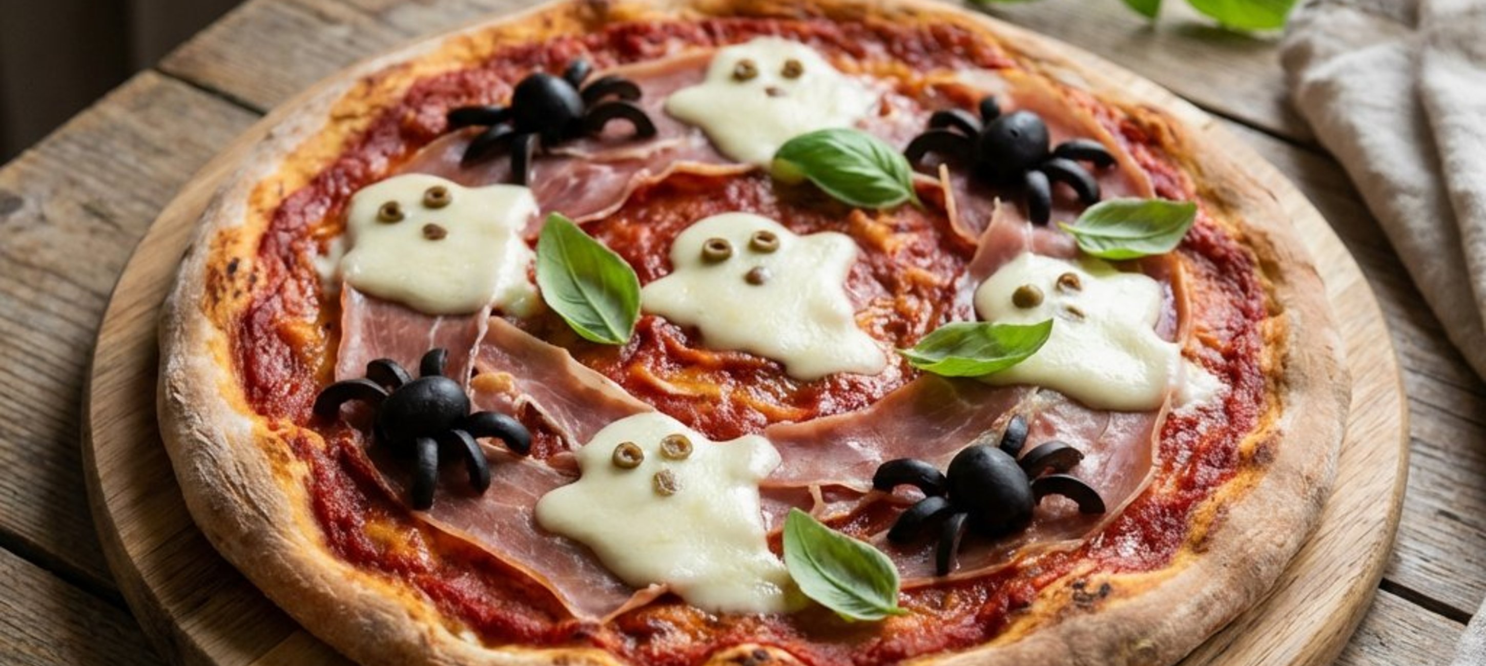 - 1Unge aluatul cu sosul pregătit. Așază feliile de prosciutto crudo. Taie mozzarella în forme care să semene cu niște fantome mici și așază-le pe pizza. Folosește măslinele negre pentru a crea fețele fantomelor și pentru a forma păianjeni (o jumătate de măslină pentru corp și fâșii subțiri pentru picioare).