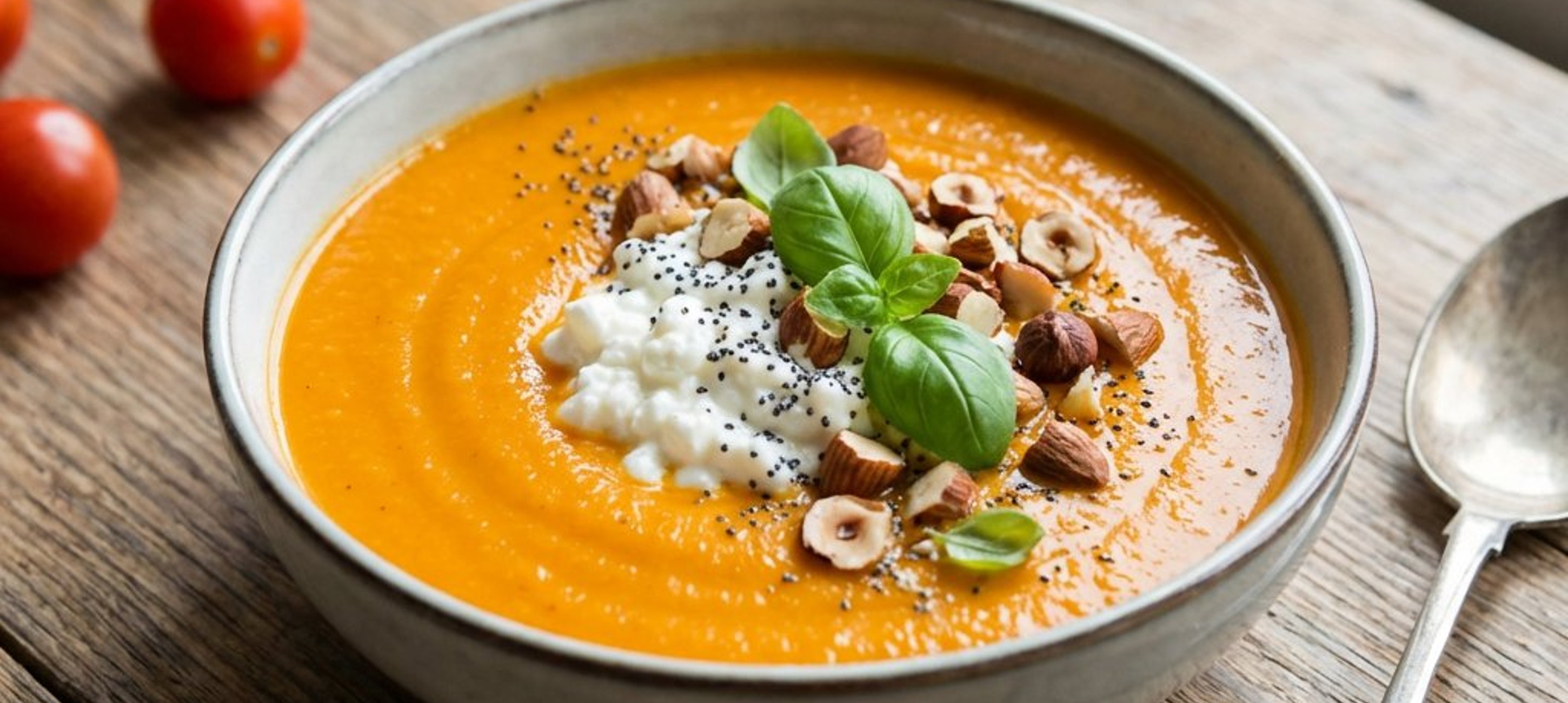 - 2Serviți supa caldă, decorată cu mixul crocant de nuci și mac și frunze proaspete de busuioc.