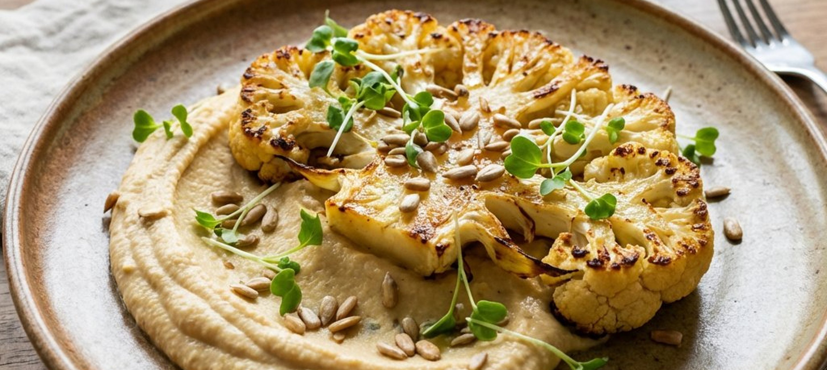 - 2Întinde crema de năut pe o farfurie. Așază deasupra steak-ul de conopidă rumenit și decorează cu semințe de floarea soarelui și un strop de ulei de chilli.